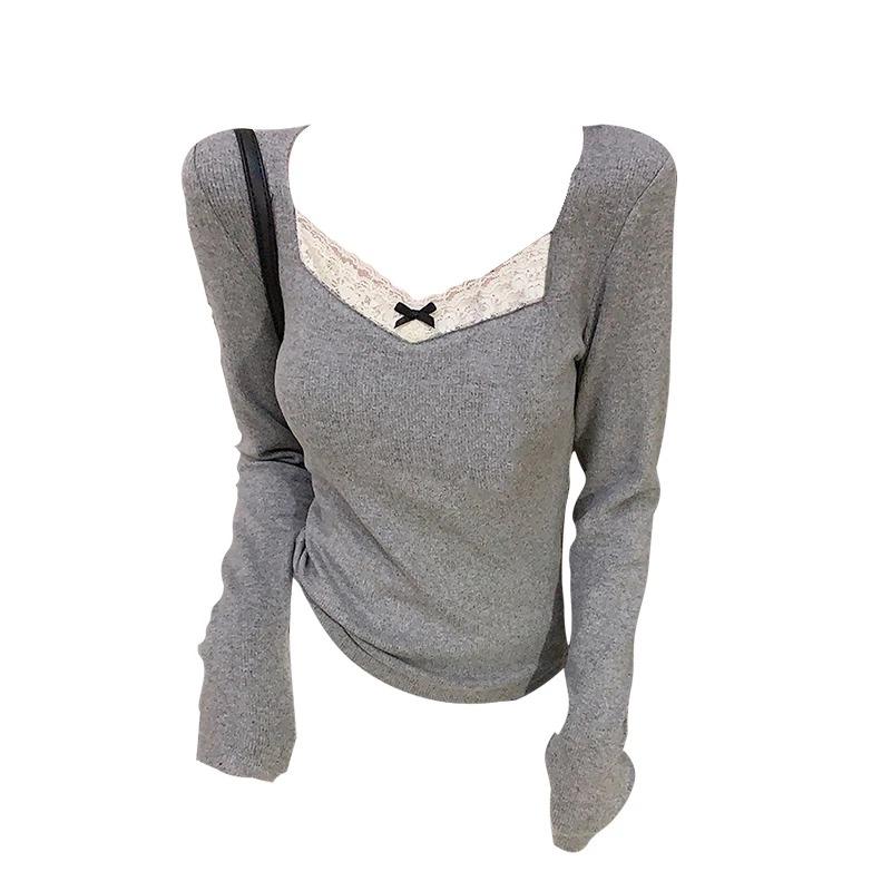 Кружевная лоскутная футболка с длинным рукавом для женщин, тонкие серые хлопковые футболки с бантом и v-образным вырезом, осенние повседневные милые милые топы Harajuku Y2k