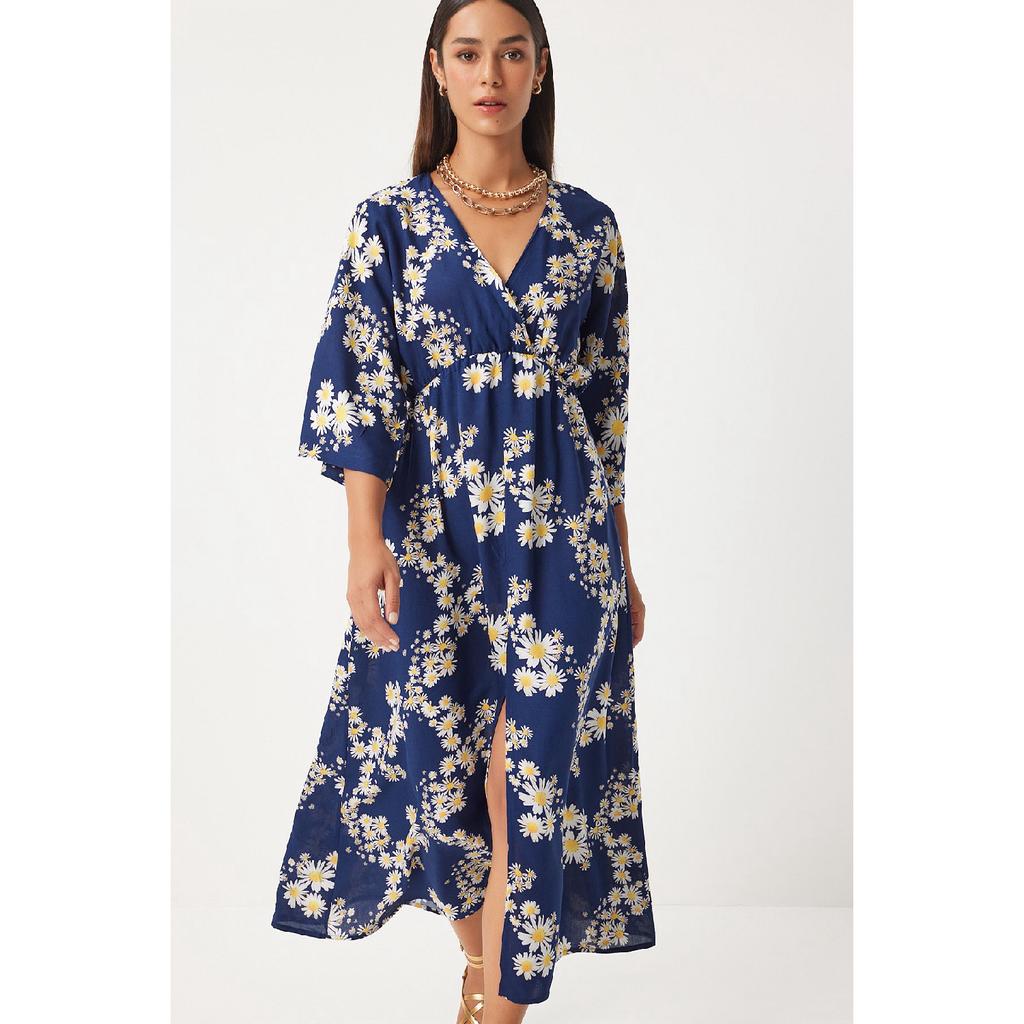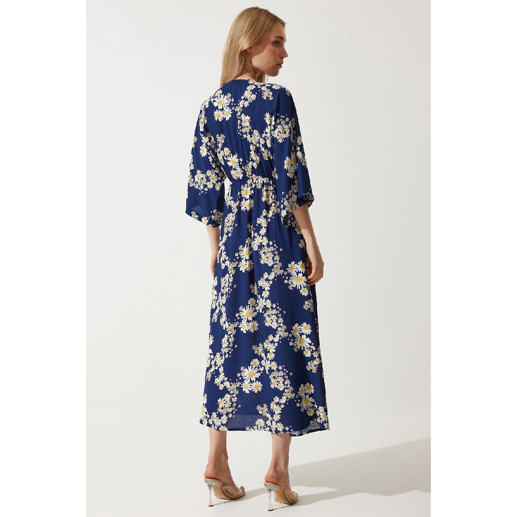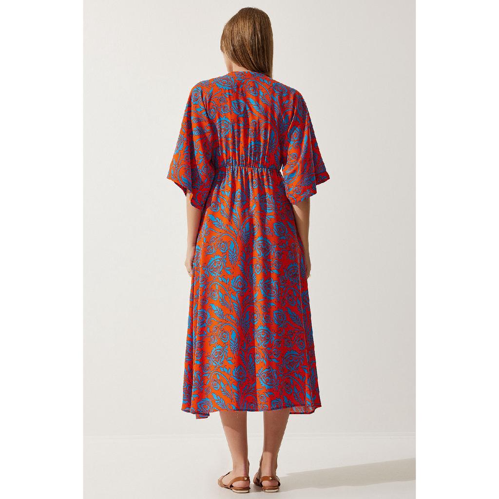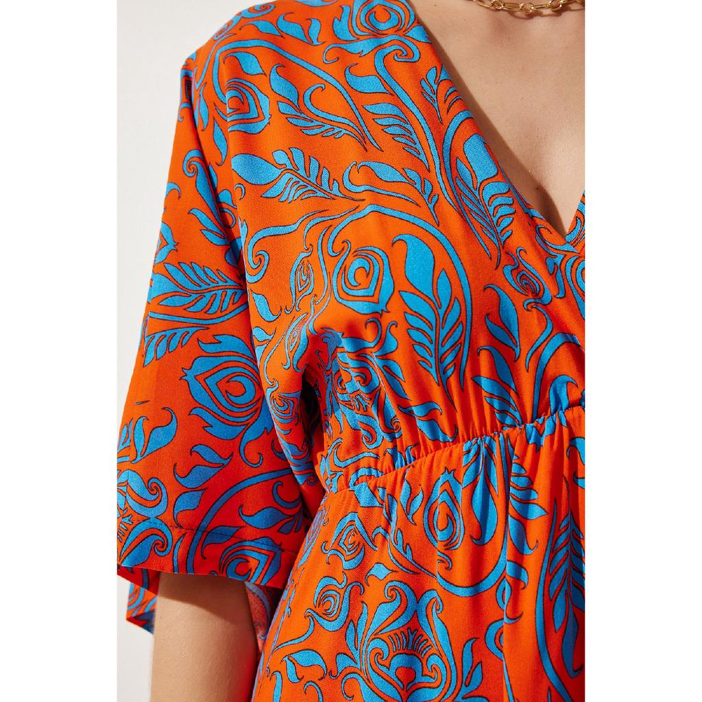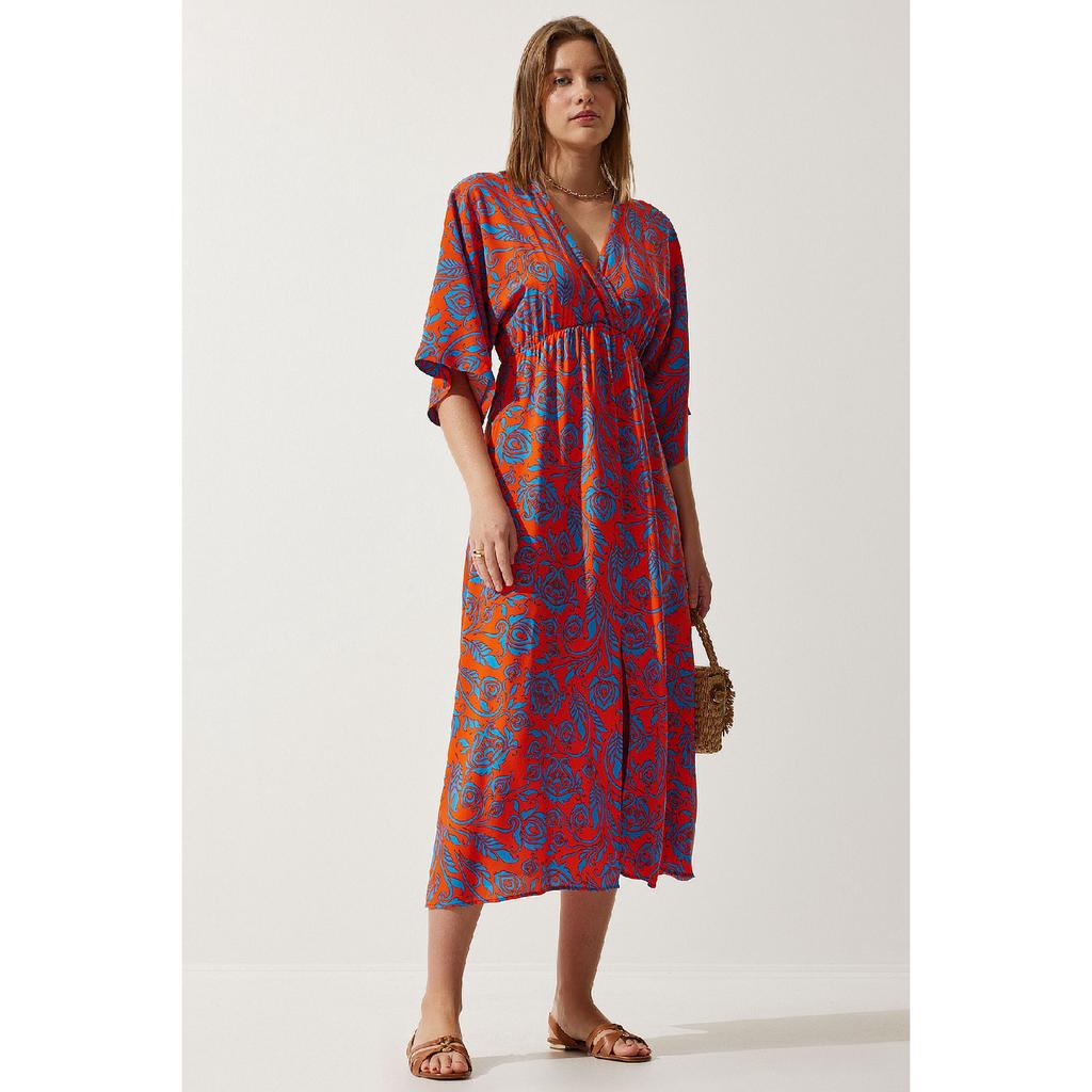 Женское оранжево-синее летнее платье из вискозы с запахом и воротником Dk00166