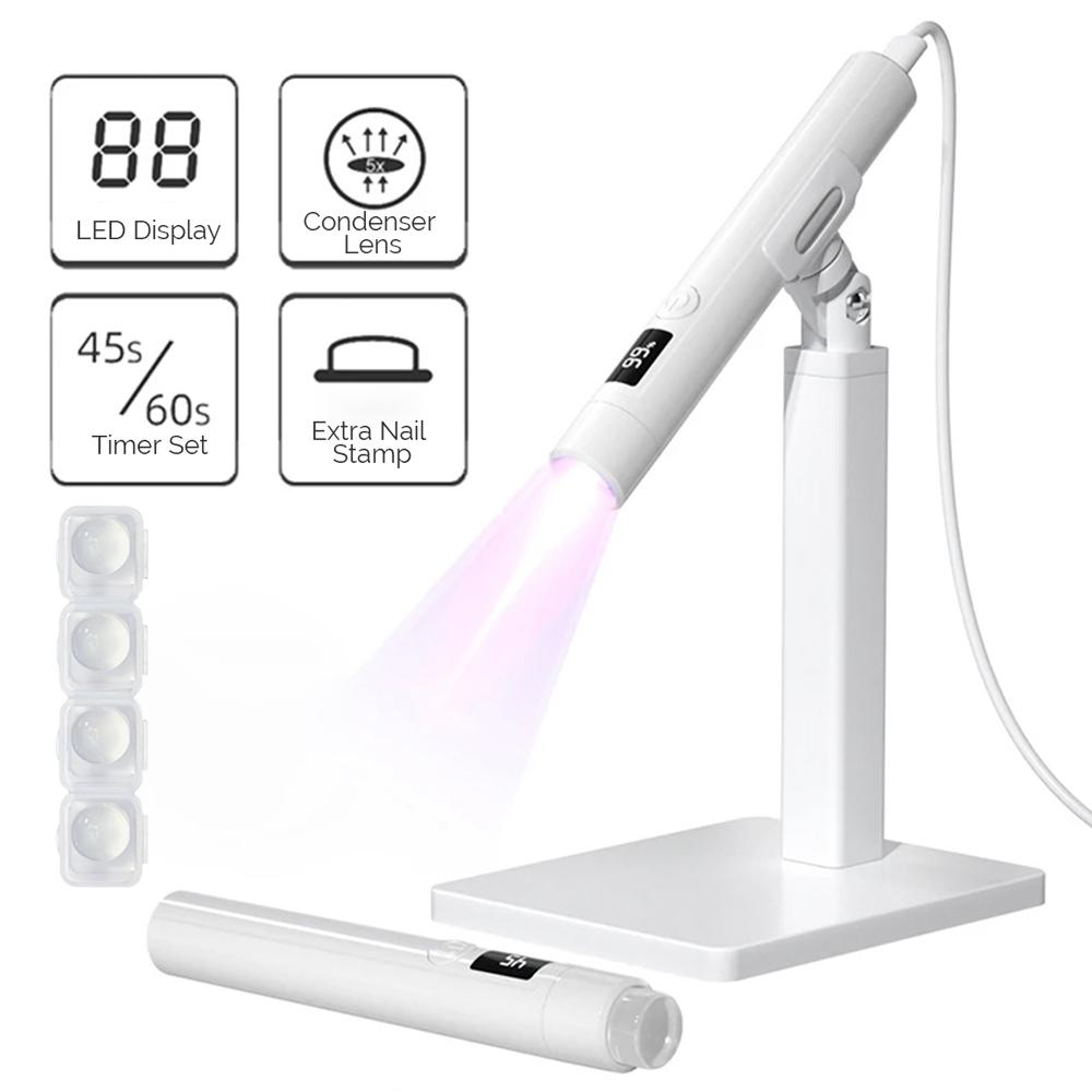 2. Быстрое высыхание за 8 сек. (8s forcuring лак для ногтей клей, 10s forcuring алмазный клей, 20s/60s forcuringстроительный гель), 1 лампочка для 5 эффектов, 5-кратные выпуклые линзы, мощный прожектор.