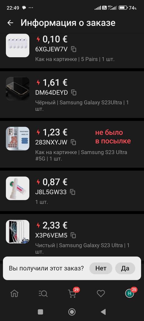 Добрый вечер! Я получила сегодня заказ, мало того, что я ждала больше месяца и он прибыл не на то отделение почты, которое я указывала, так в нём не оказалось 1 товара - чехла на телефон Самсунг S23 Ultra с мишкой