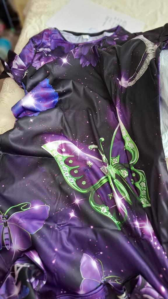 1. рисунок смещен, от этого смотрится "колхозно" 2. размер явно не соответствует заявленному ( жена реально дюймовочка, платье на бабищу размера 52) 3. краски тусклые 4. рисунок смазанный... 5. пошито криво 6. Низ прямой, скошенный... Короче в помойку жене не буду даже показывать