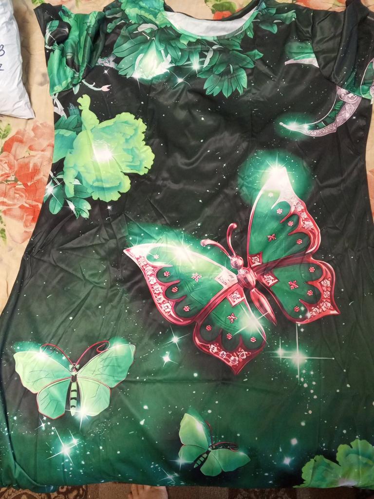 Пришло платье, качество отличное, но с размером, ошиблась. На мой58 надо было брать 3XL. А так только для дома, большевато, смотрится как мешок. Оно хорошо тянется, берите размер в размер, можно даже на размер меньше. А так смотрится отлично, на свету рисунок аж сияет.