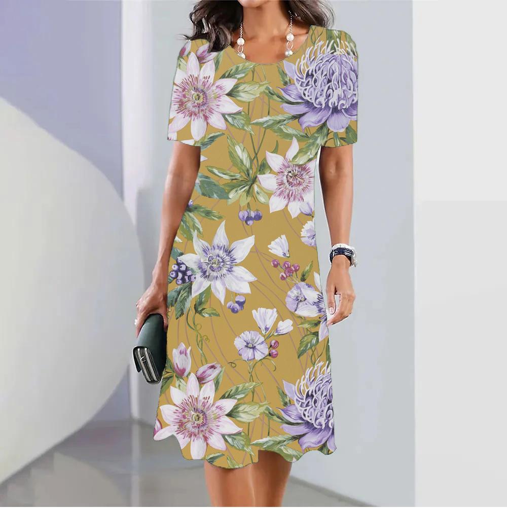 Платья для женщин больших размеров Boho с коротким рукавом и круглым вырезом с цветочным принтом и круглым вырезом миди-платье Элегантные женские платья для отдыха