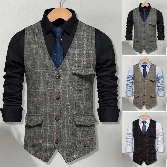 Наш жилет в винтажном стиле с клетчатым принтом имеет три кармана и однобортную застежку для более элегантного образа.