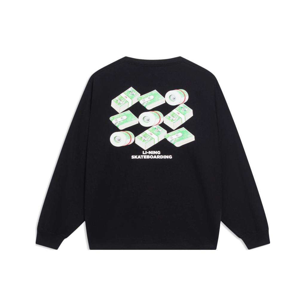 Li-Ning Футболка унисекс с длинным рукавом и круглым вырезом, с принтом на спине Skateboard Series, черная, AHST103-3