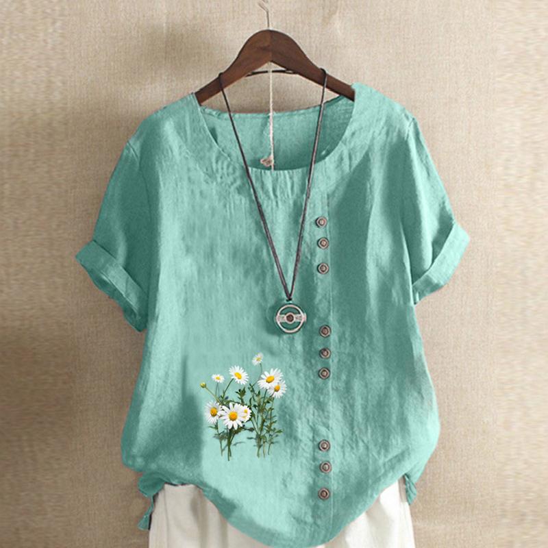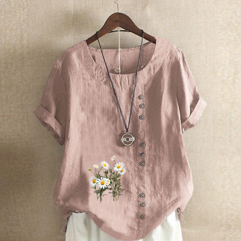 Женская модная футболка с круглым вырезом и коротким рукавом, повседневная хлопковая льняная рубашка с графическим принтом, свободная летняя блузка с цветочным принтом, топы