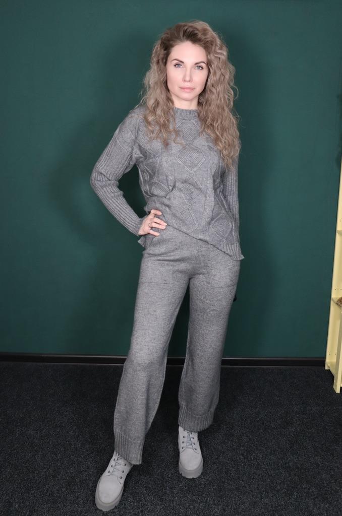 На параметры 88-78-104, рост 158 см, хорошо сел костюм. Рукав длину подвернуть или приподнять. Свитер до середины бедра, или чуть выше, на 1 см. Шлици с двух сторон по 4 см. (разрезы). Шерсть в составе есть, брюки на голое тело прокалывают, свитер, не чуствуется. Рисунок свитера только на груди, спинка гладкая. Брюки с карманами. Резинка широкая, свободная.