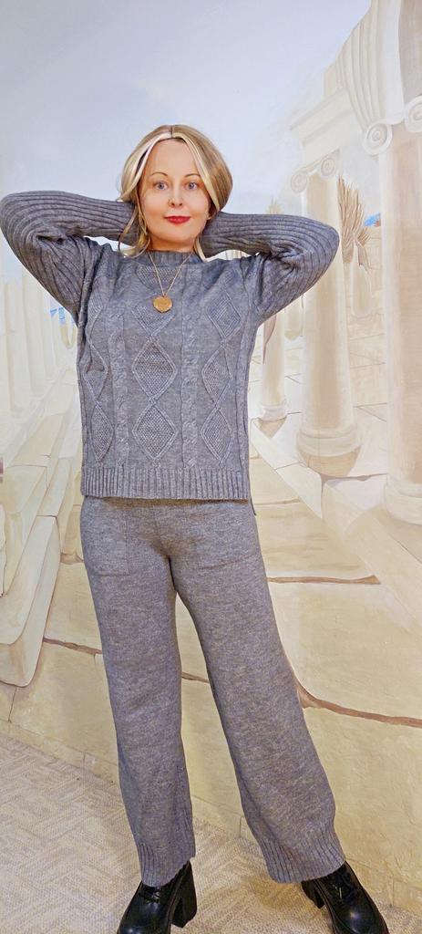 Серый, тёплый костюм. Отличный вариант на прохладное время года. Ткань приятная, не искрит, не колючая. На невысокой рост. У брючек есть кармашки. Кофта со спущенными плечами и разрезами по бокам, сзади кофта чуть длиннее. Отлично тянется, без просветов. Размерной сетке соответствует. Идёт в одном размере, и в шести вариантах расцветки. 👱🏼♀️ Мои параметры: 📌 Рост -163 см 📌 ОГ -90 см 📌 ОТ -66 см 📌 ОБ -92 см 📌 Плечи -37 см ⭐️⭐️⭐️⭐️⭐️ Супер костюмчик, с удовольствием рекомендую 👌🏻👏🏻✨✨✨