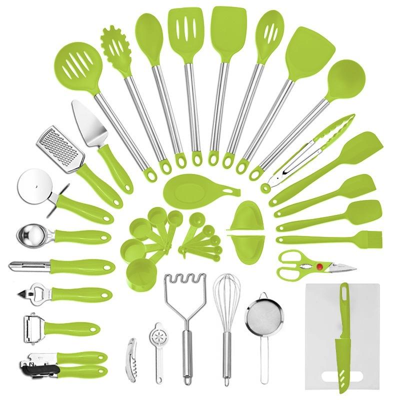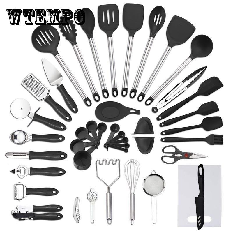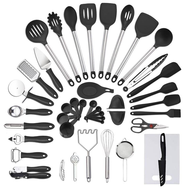 42 шт., черный силиконовый набор кухонных принадлежностей, антипригарная сковорода, инструменты для выпечки, кухонная утварь, лопаточка с прорезями, ложка, щипцы для еды, кухонный набор