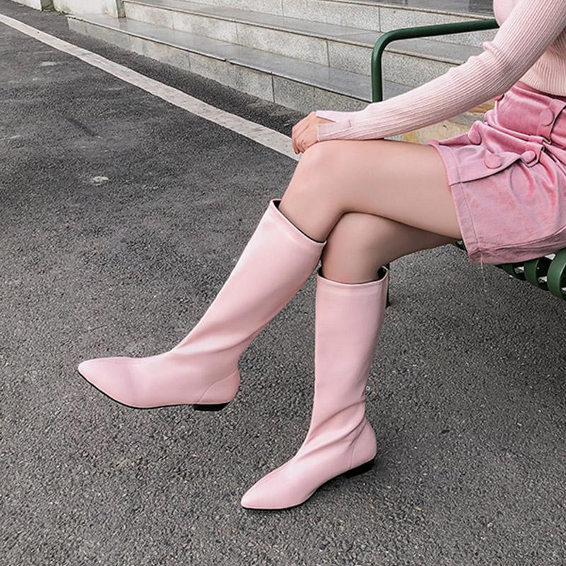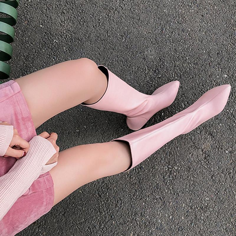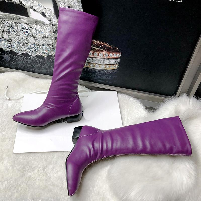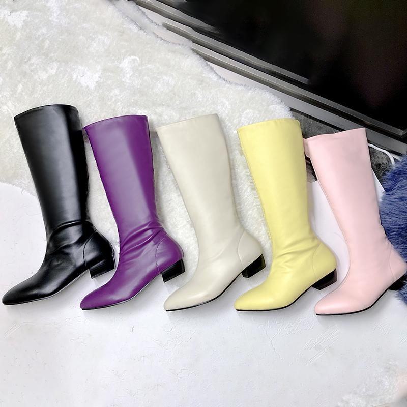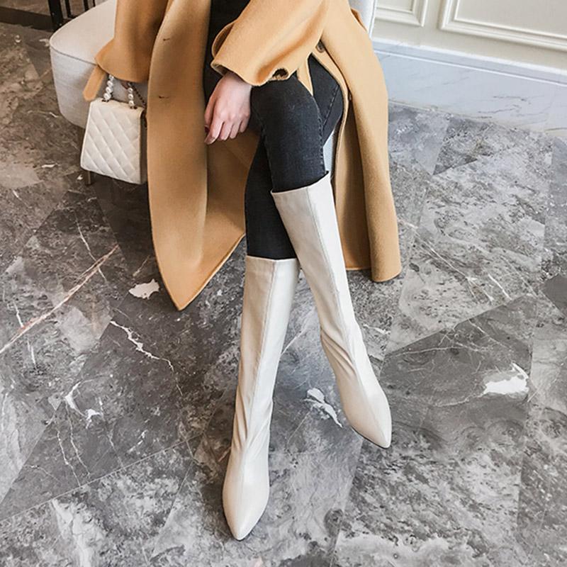 Женские длинные сапоги на низком каблуке, осенне-зимняя новинка, однотонные длинные сапоги с острым носком на толстом каблуке, большие размеры