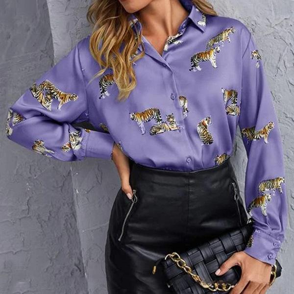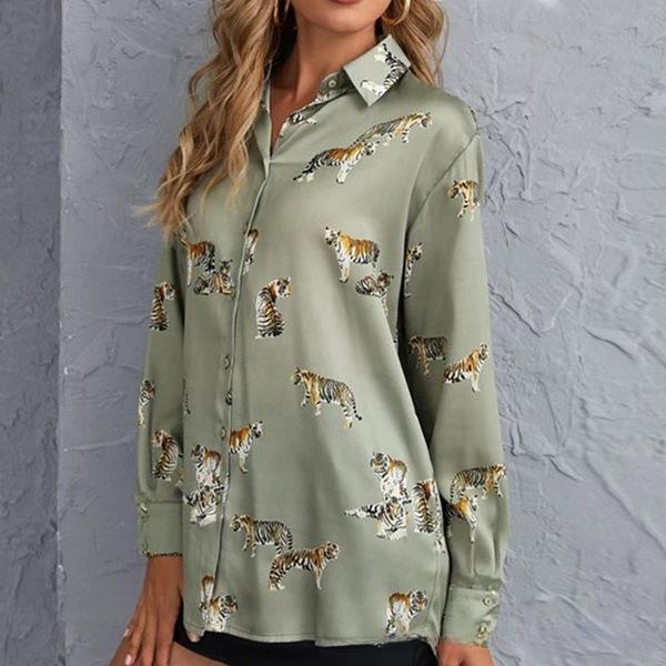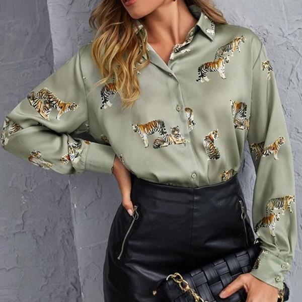 Рубашка большого размера для женщин на весну и осень, длинная, с длинным рукавом, отворотом, одним рядом пуговиц, с принтом тигрового узора