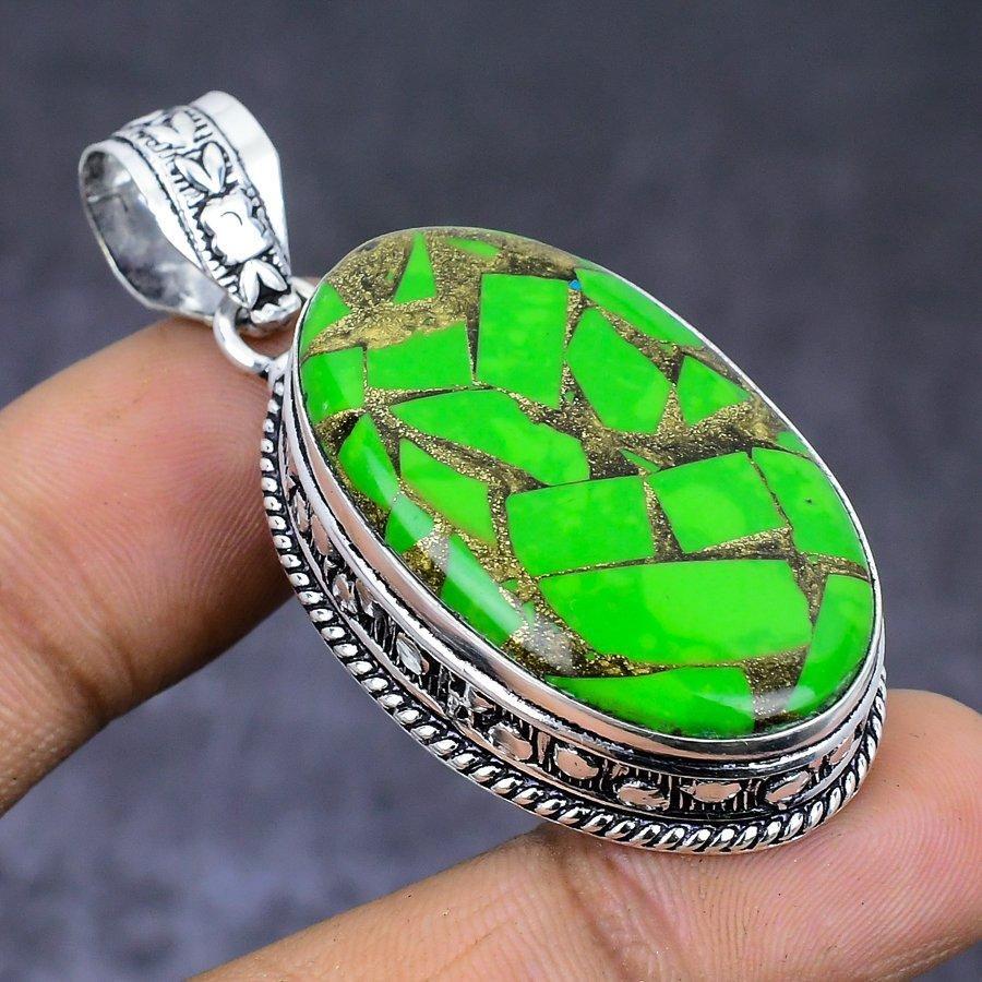 Медь Зеленый Бирюзовый Драгоценный камень 925 Стерлинговое серебро Ювелирное изделие Кулон 2,13" E2J97