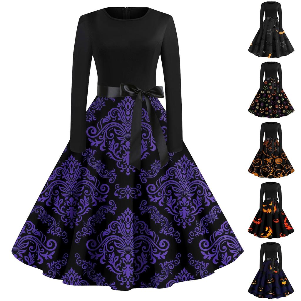 Платье на Хэллоуин для женщин с винтажным принтом и длинным рукавом с круглым вырезом, вечерние платья больших размеров для выпускного вечера