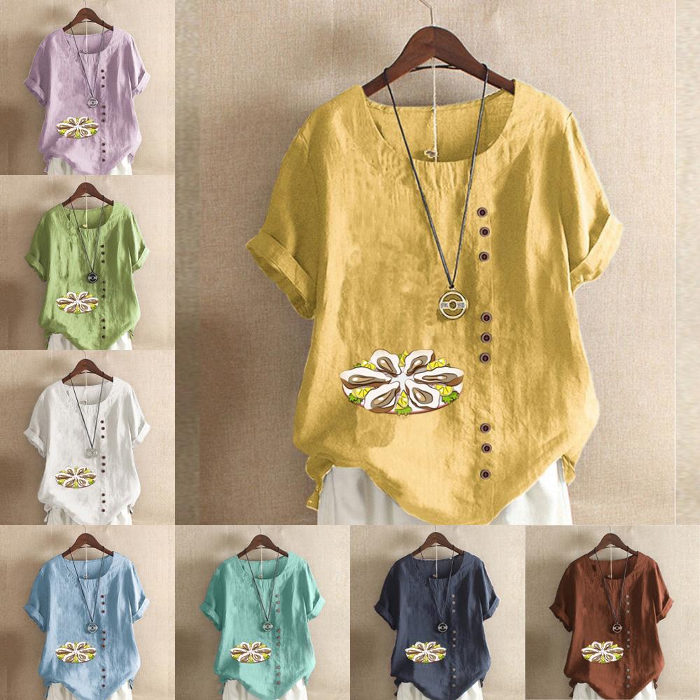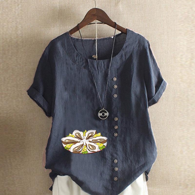 Женская новая модная льняная рубашка с круглым вырезом и коротким рукавом с принтом устриц, летняя женская повседневная блузка, топы