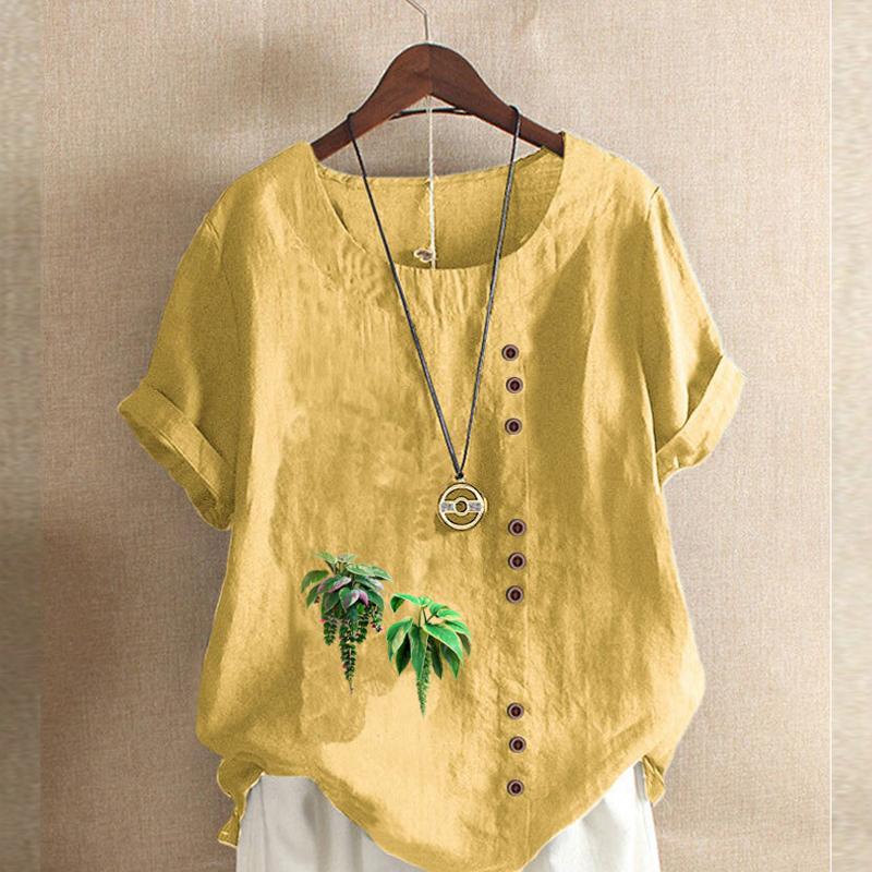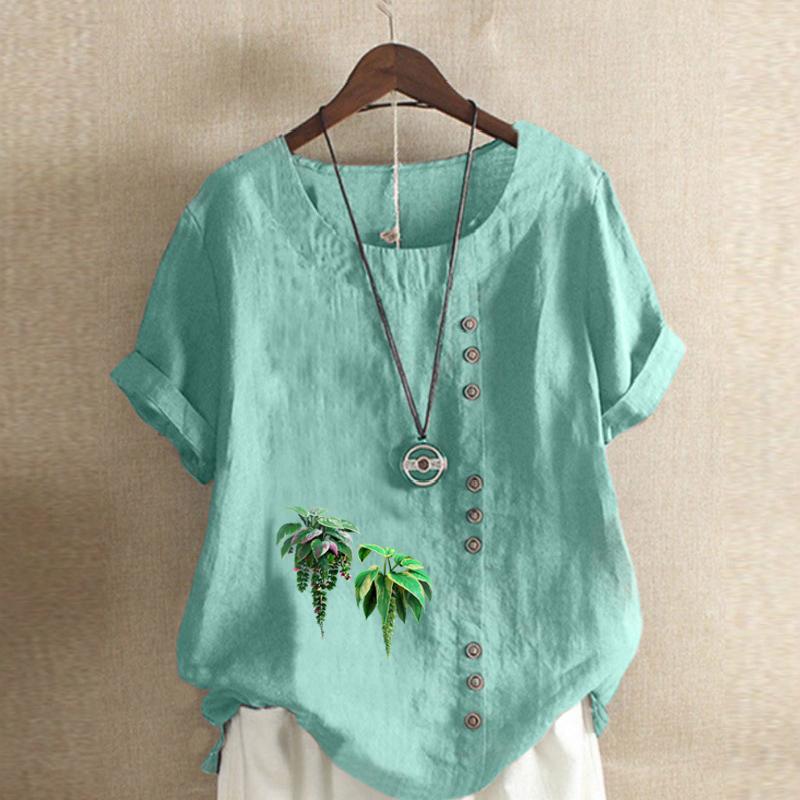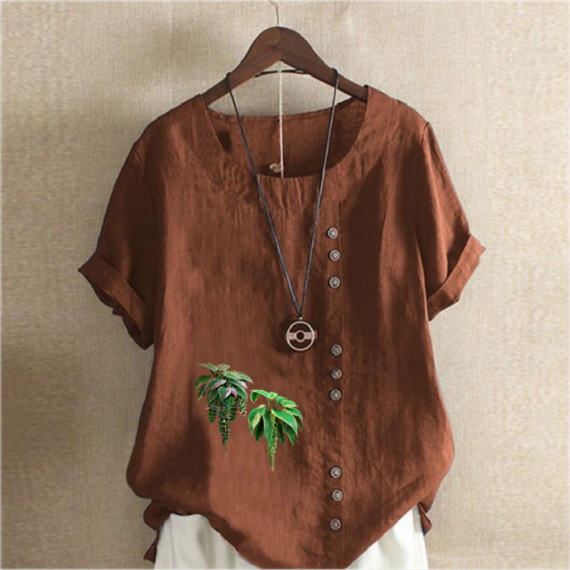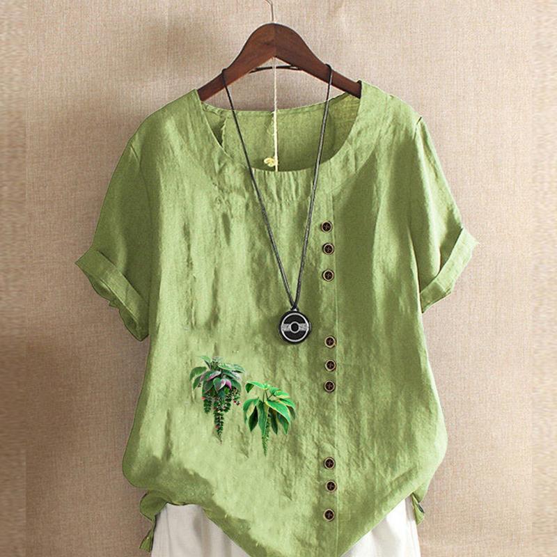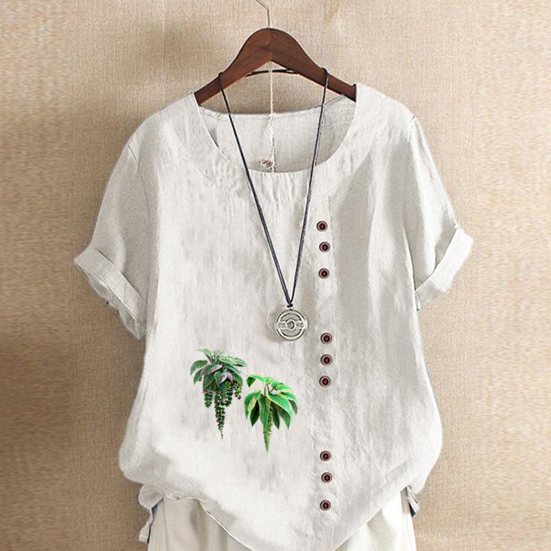 Женская модная футболка с круглым вырезом и коротким рукавом, повседневная хлопковая льняная рубашка с принтом зеленых растений, летняя блузка, топы больших размеров