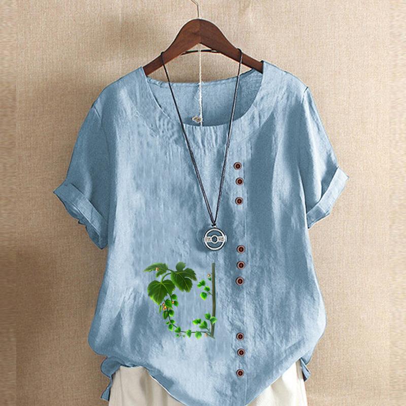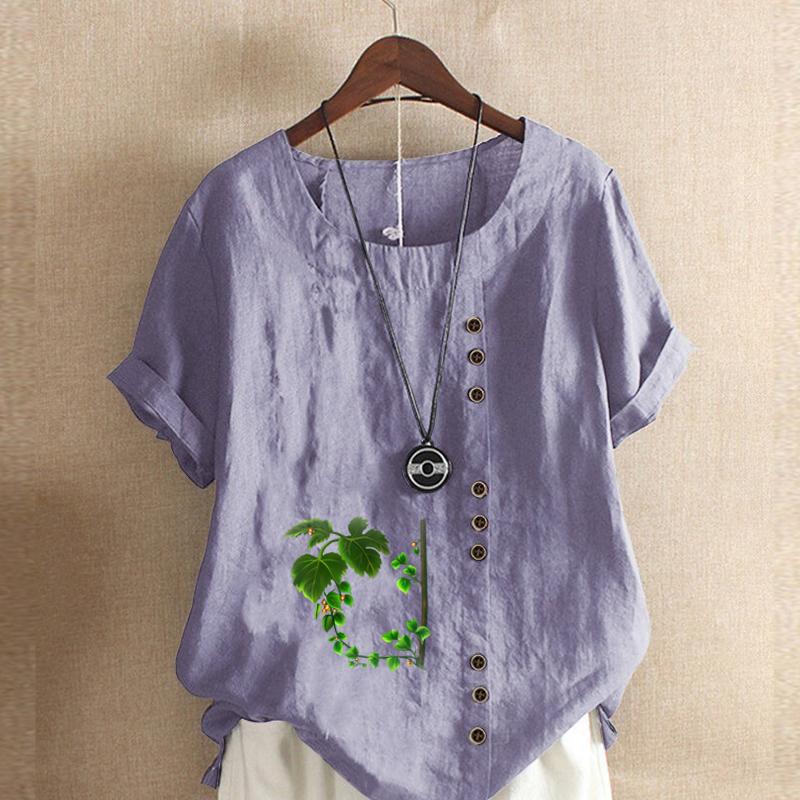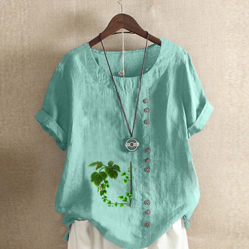 Women's New Fashion Linen Shirt Round Neck Short Sleeve Green Plants Printed T-shirt Summer Ladies Casual Blouse Tops
