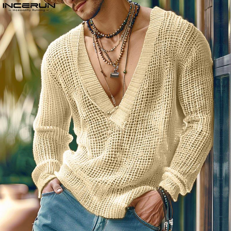 INCERUN Мужские повседневные топы с длинным рукавом и вырезом, прозрачные пуловеры — купить товар онлайн с бесплатной доставкой до всему миру!
