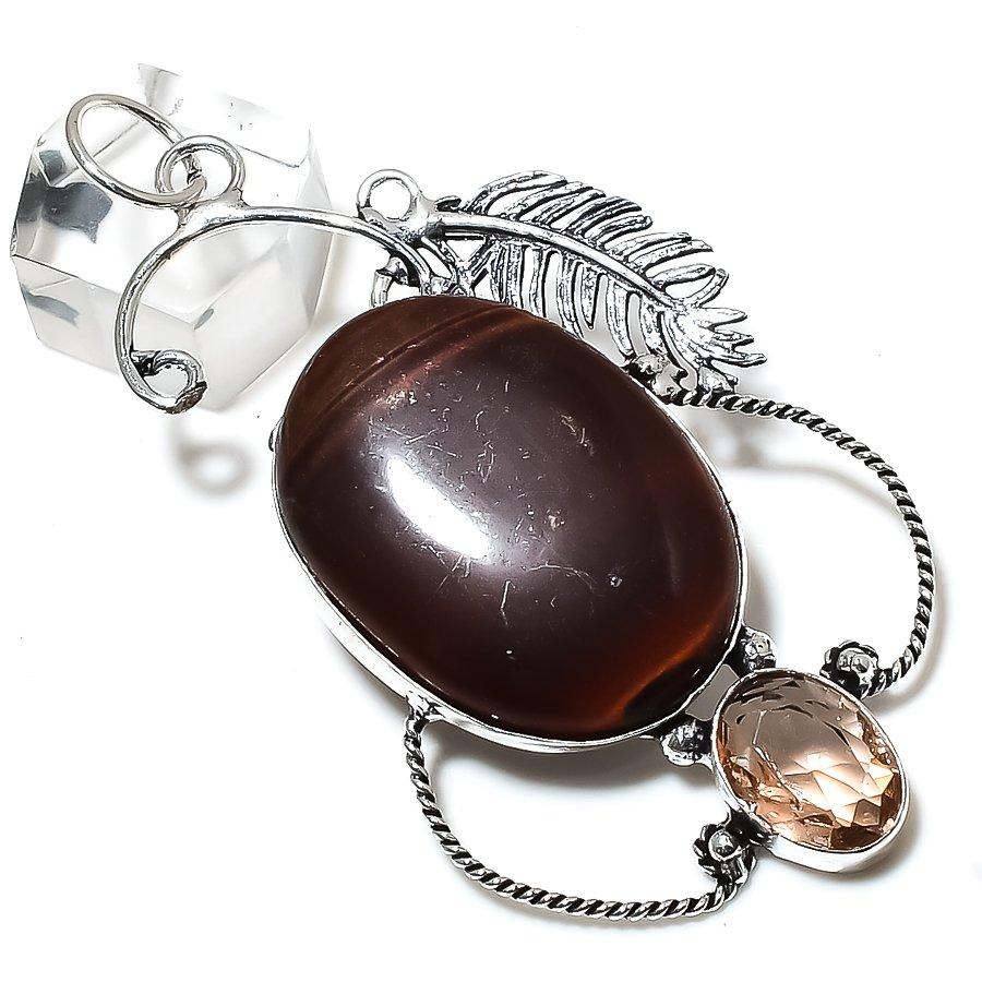 Red Tiger Eye, Morganite Gemstone 925 Sterling Silver Jewelry Pendant 3.15" E6l00