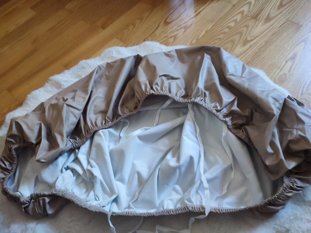Виниловая скатерть на резинке. Удобная и хорошая вещь. Размеру соответствует. Дополняю. Пятен на скатерти не остаётся, достаточно только промокнуть или протереть любое пятно, и оно исчезает. Очень удобно.