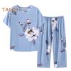 Стильный дизайн: В пижамный комплект входит топ с круглым вырезом и короткими рукавами, украшенный очаровательными цветочными принтами и милыми рисунками, которые придадут нотку стиля вашей коллекции домашней одежды.. Классический дизайн с круглым вырезом придает вневременную привлекательность, а свободные прямые брюки создают ощущение уюта.