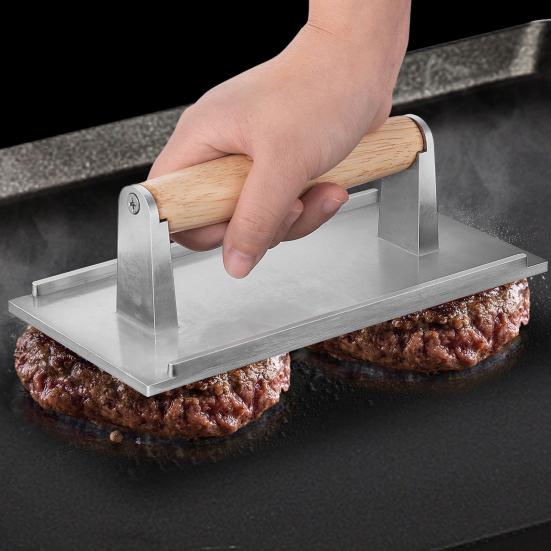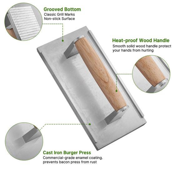 Основа здоровой кулинарии: Улучшите свои навыки приготовления на гриле с помощью нашего пресса для мяса, изготовленного из прочного пищевого алюминиевого сплава.. Эта лопатка для гамбургеров на сковороде обеспечивает равномерное распределение тепла, выжимая из мяса лишний жир и масло, обеспечивая более здоровый результат и сокращая время приготовления.
