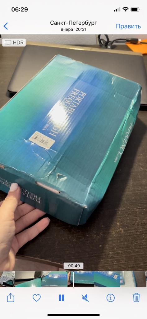 Всё работает, коробка повреждена. Насадка основная с трещиной.