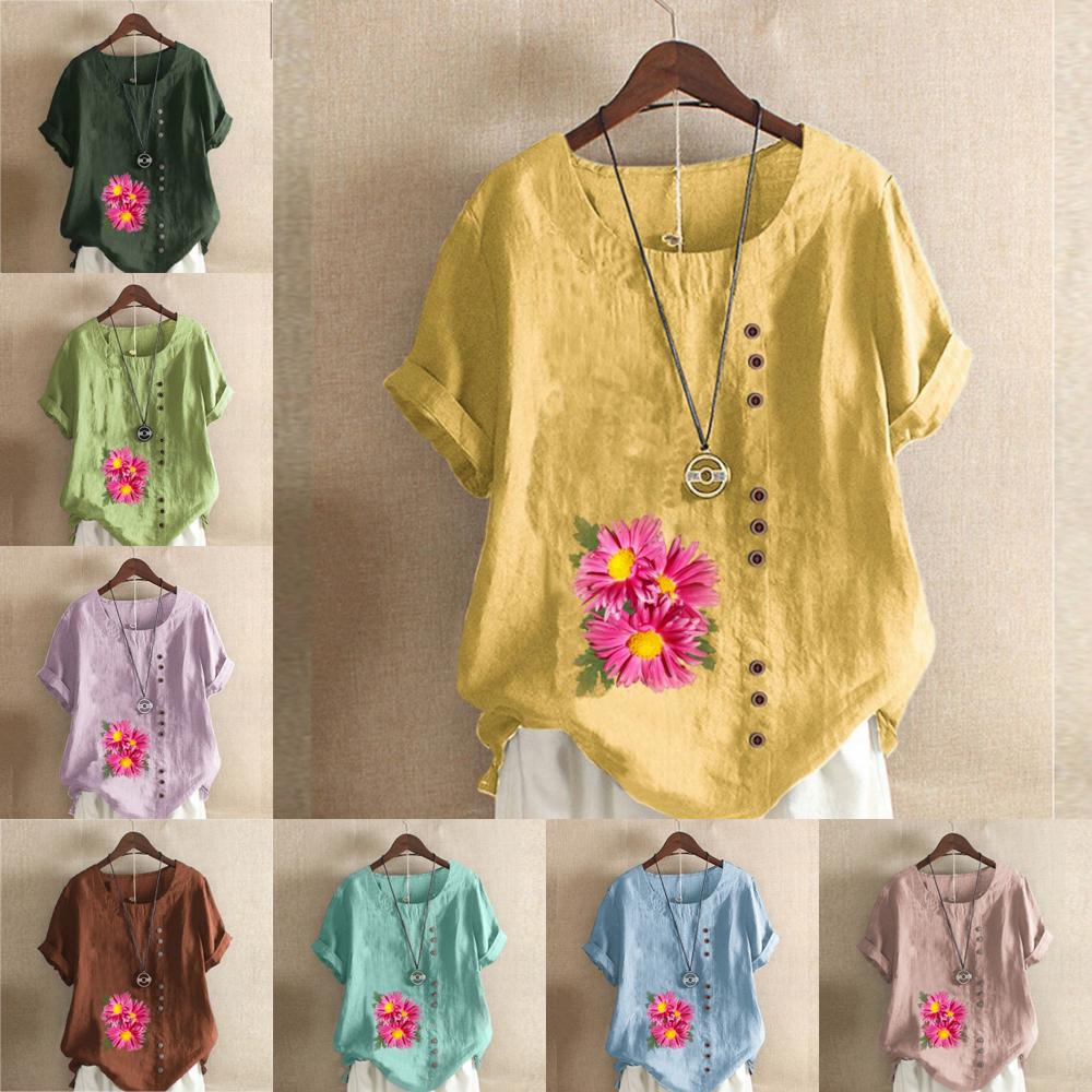 Женская модная футболка с цветочным принтом и круглым вырезом, с коротким рукавом, повседневная хлопково-льняная рубашка с рисунком, свободная летняя блузка для отдыха, топы — купить товар онлайн с бесплатной доставкой по всему миру!