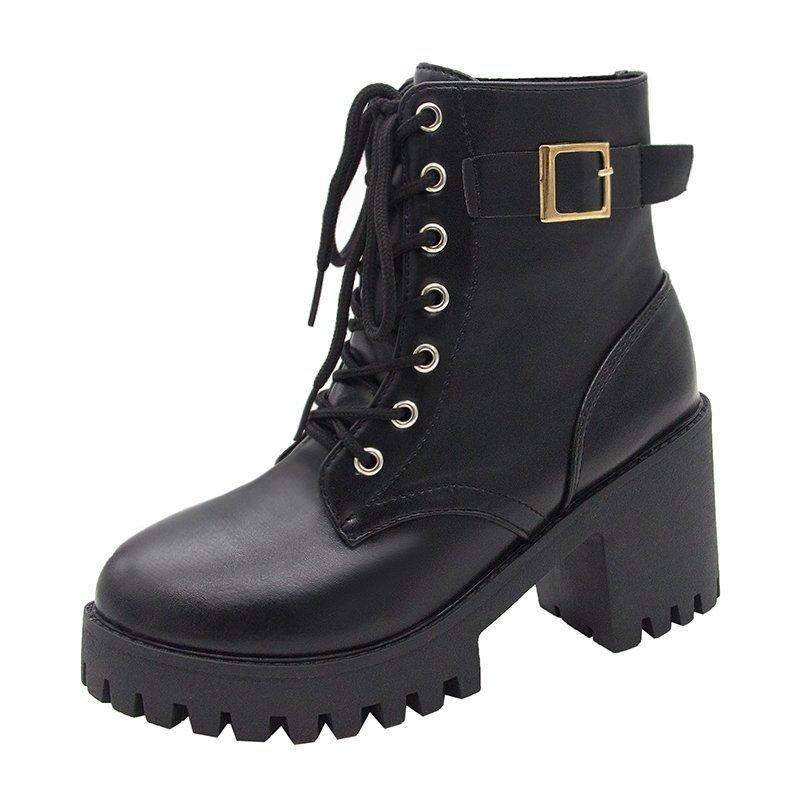 Осенние одинарные ботинки, черные ботинки Martin на шнуровке, круглый носок, толстый каблук, высокий каблук, пряжка на ремне, женские короткие ботинки