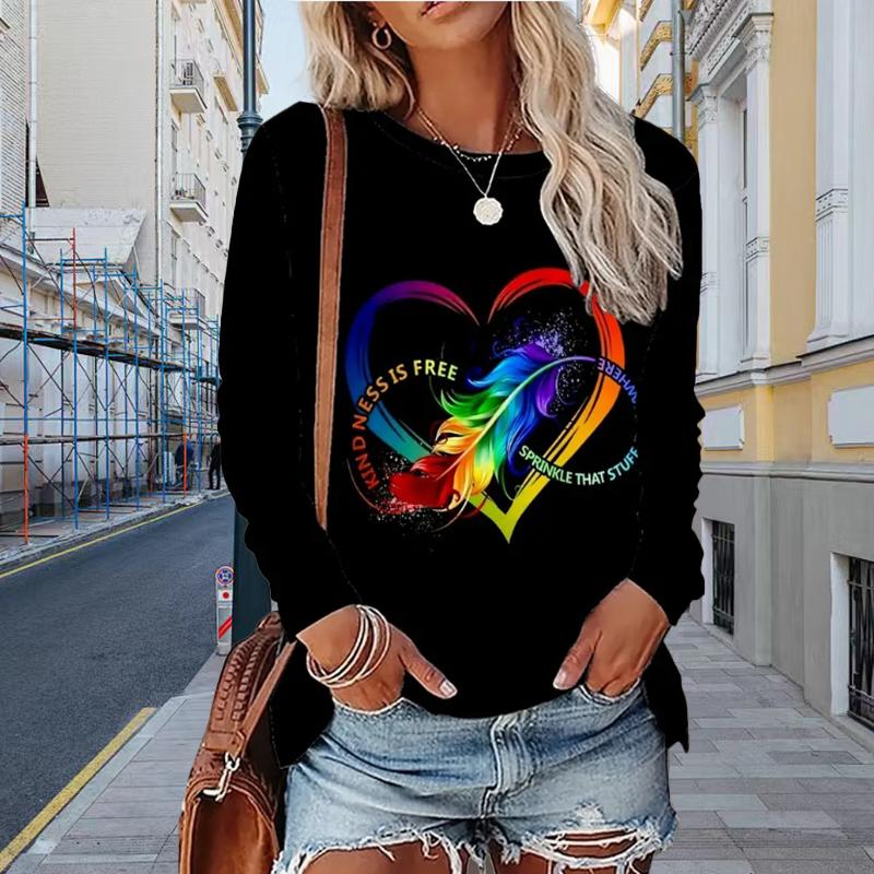 Топы для женщин, разноцветный принт в форме сердца с перьями, круглый вырез, длинный рукав, футболка, осенний повседневный тонкий пуловер, женский топ с длинным рукавом