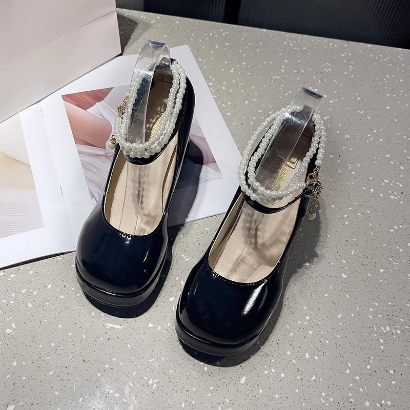 Туфли Мэри Джейн на высоком квадратном каблуке с круглым носком, повседневные, 2024 г., горячая распродажа, женские туфли с пряжкой на ремне, с ниткой и бусинами, однотонные туфли