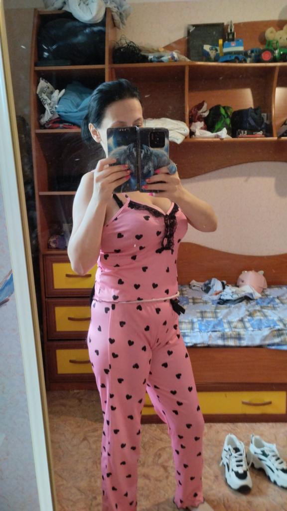 Быстрая доставка. Все как в описании. Верх очень мягкий и приятный к телу. На 48-50, свободно как и хотела. Штанишки чуть меньше. Обычная дешевенькая пижамка. Запах хозяйственного мыла))) Брала за 500 руб. Дополняю отзыв: постирала, цвет не изменился)