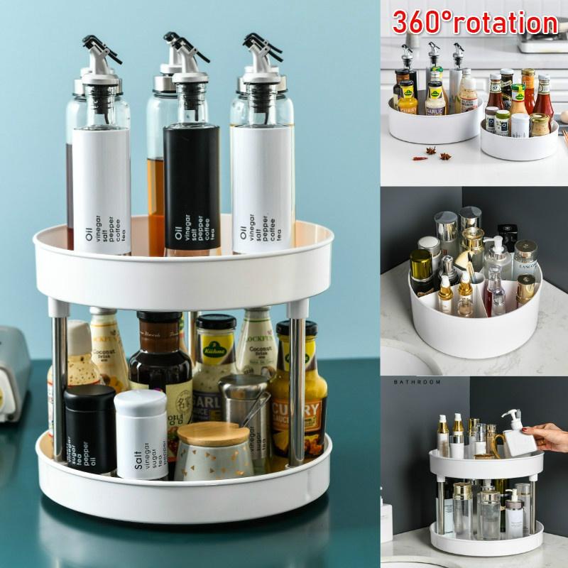 Вращающаяся стойка для хранения приправ, стойка для хранения косметики, 2-слойный поднос для банок со специями и солью, кухонный органайзер, экономящий место, полка, держатель для бытовых принадлежностей — купить товар онлайн с бесплатной доставкой по всему миру!