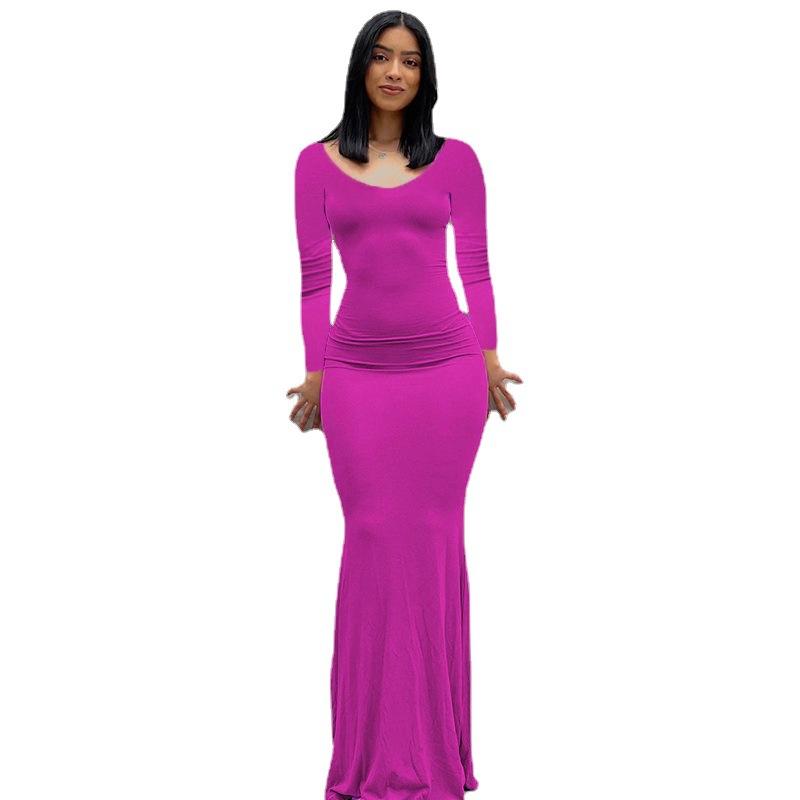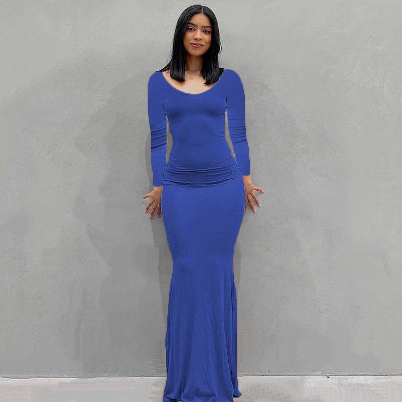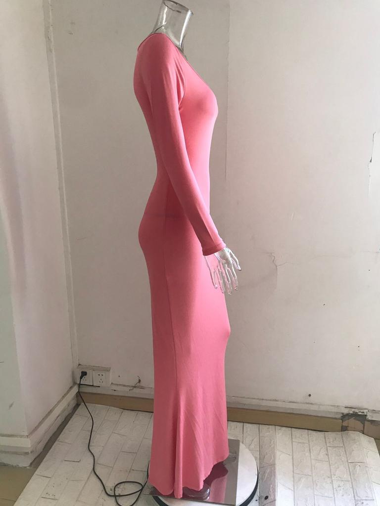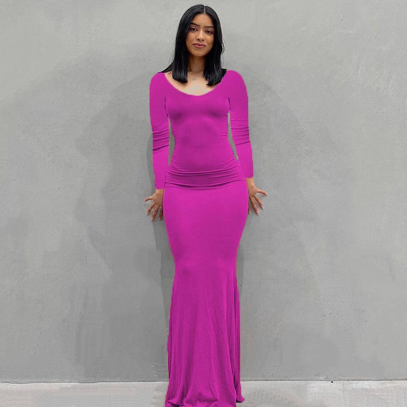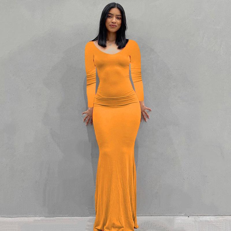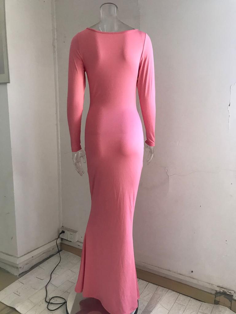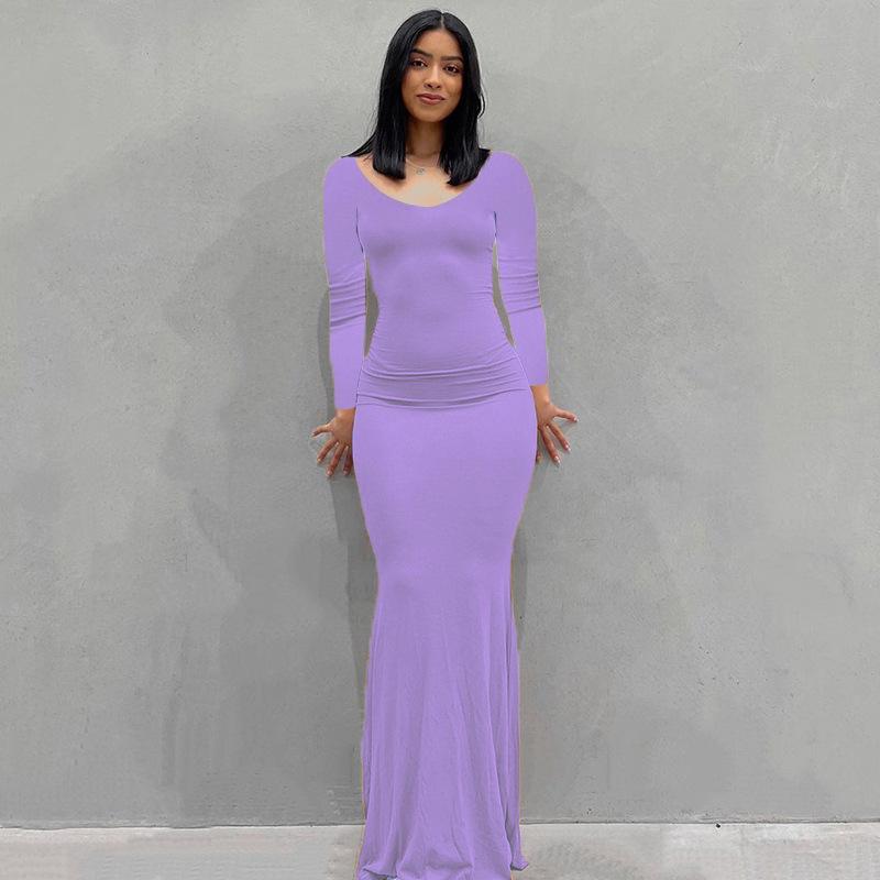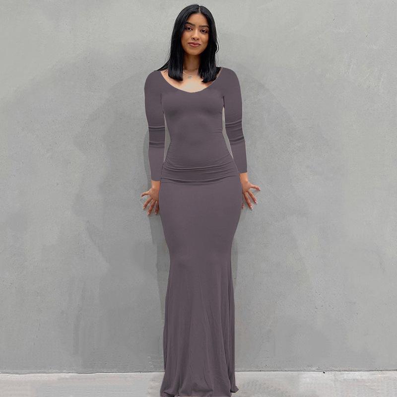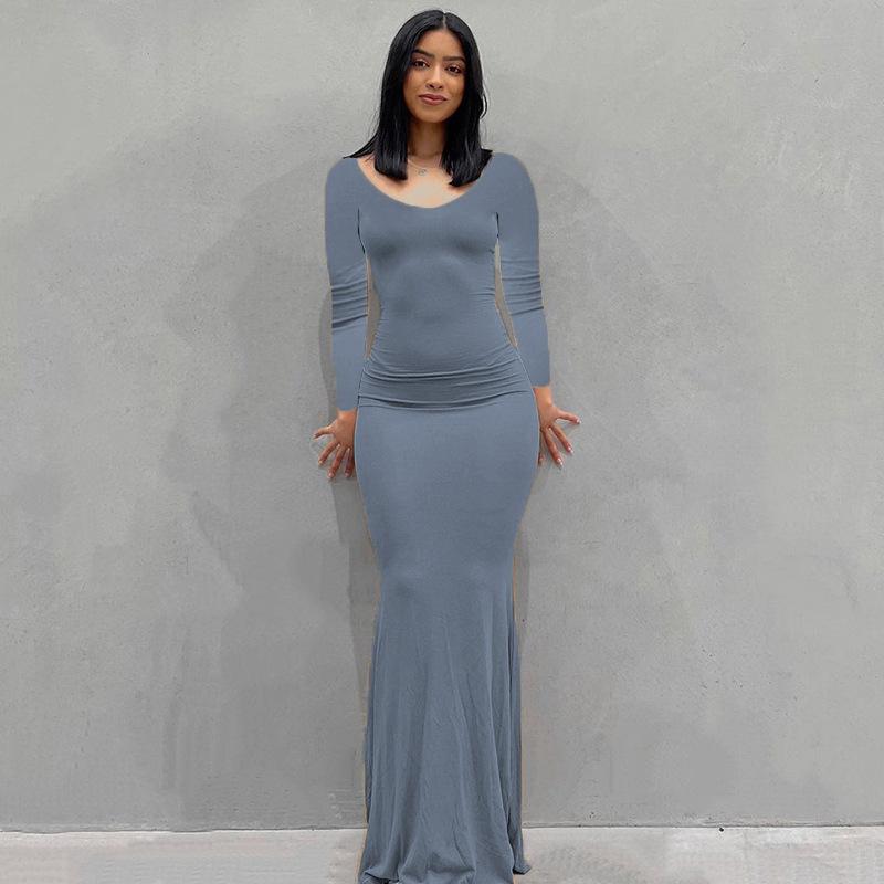 Женское однотонное повседневное длинное облегающее платье с длинным рукавом и V-образным вырезом