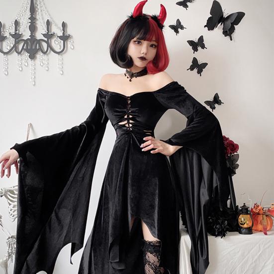 Подчеркните свой готический стиль с помощью этого элегантного и сексуального женского платья.. Это готическое платье ведьмы с сексуальным дизайном с открытыми плечами, полой талией, широкими рукавами «летучая мышь» и нестандартным большим платьем излучает причудливое и темное очарование.. Изготовлен из мягкой и удобной полиэфирной ткани, дышащей и приятной для кожи..