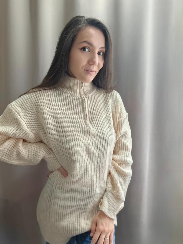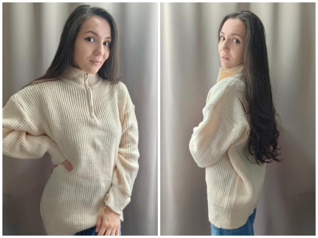Универсальный свитер. Подойдет как мужчинам , так и женщинам. У продавца ассортимент в разных цветах. Свитер я заказала мужу. Но сфоткаться пришлось самой. Может позже добавлю фотографии как смотрится свитер на нём. А пока, вот я. Мои параметры: 90/70/86 На мне смотрится как оверсайз. На теле приятно. Не колется. Состав: полиэстер. Шею можно закрыть, застегнув имеющуюся молнию. Свитер подойдет на теплую осень. Прохладное лето. Рекомендую к покупке.