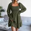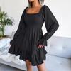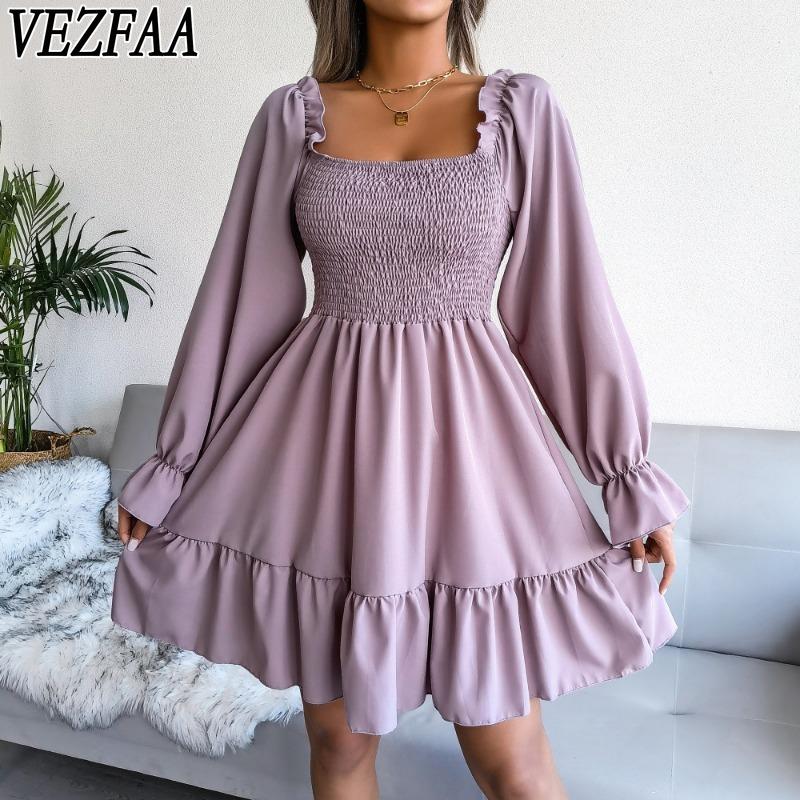 VEZFAA Женская мода Весна Осень Однотонный принт Длинный рукав Квадратный вырез Высокая талия Повседневные платья — купить товар онлайн с бесплатной доставкой по всему миру!