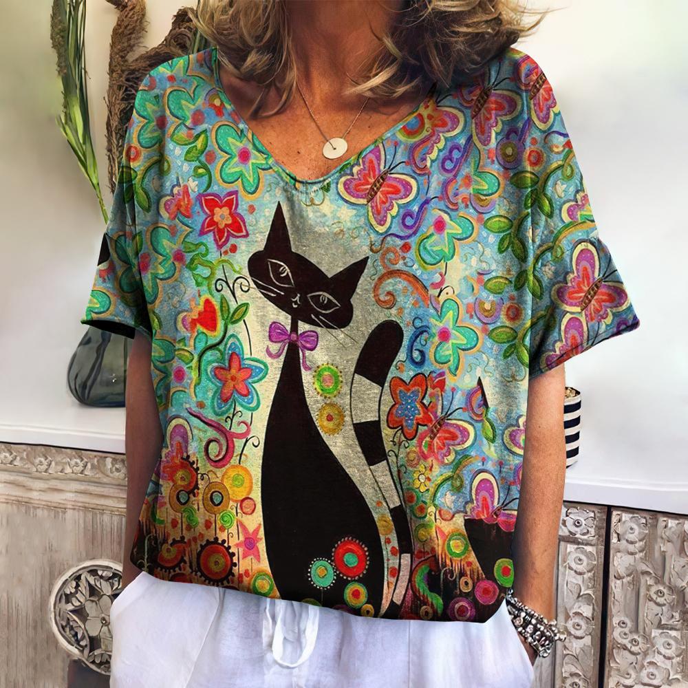 Женская футболка с принтом мультяшного кота, топ больших размеров, летняя женская трендовая одежда, модная рубашка с коротким рукавом и V-образным вырезом, Harajuku — купить товар онлайн с бесплатной доставкой по всему миру!