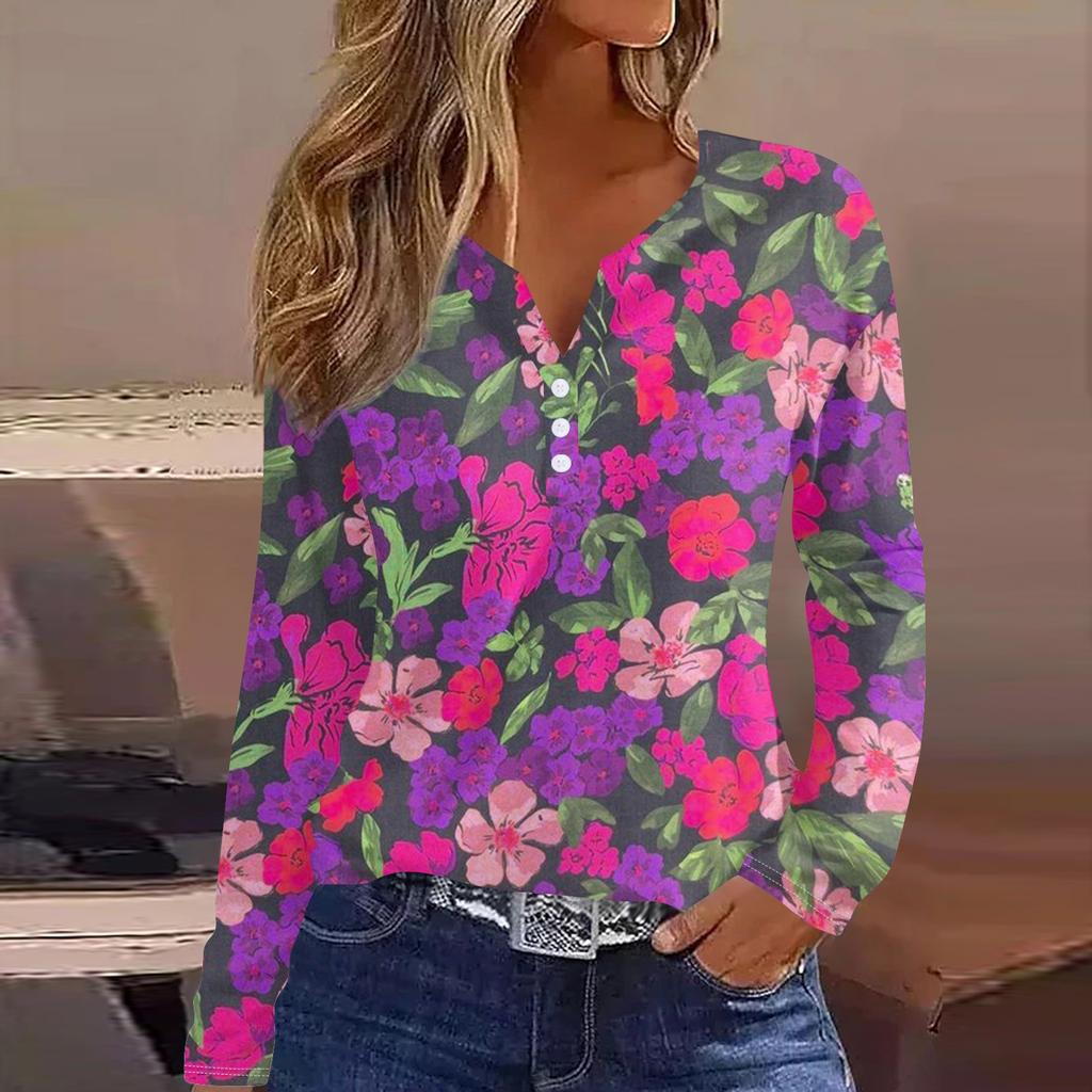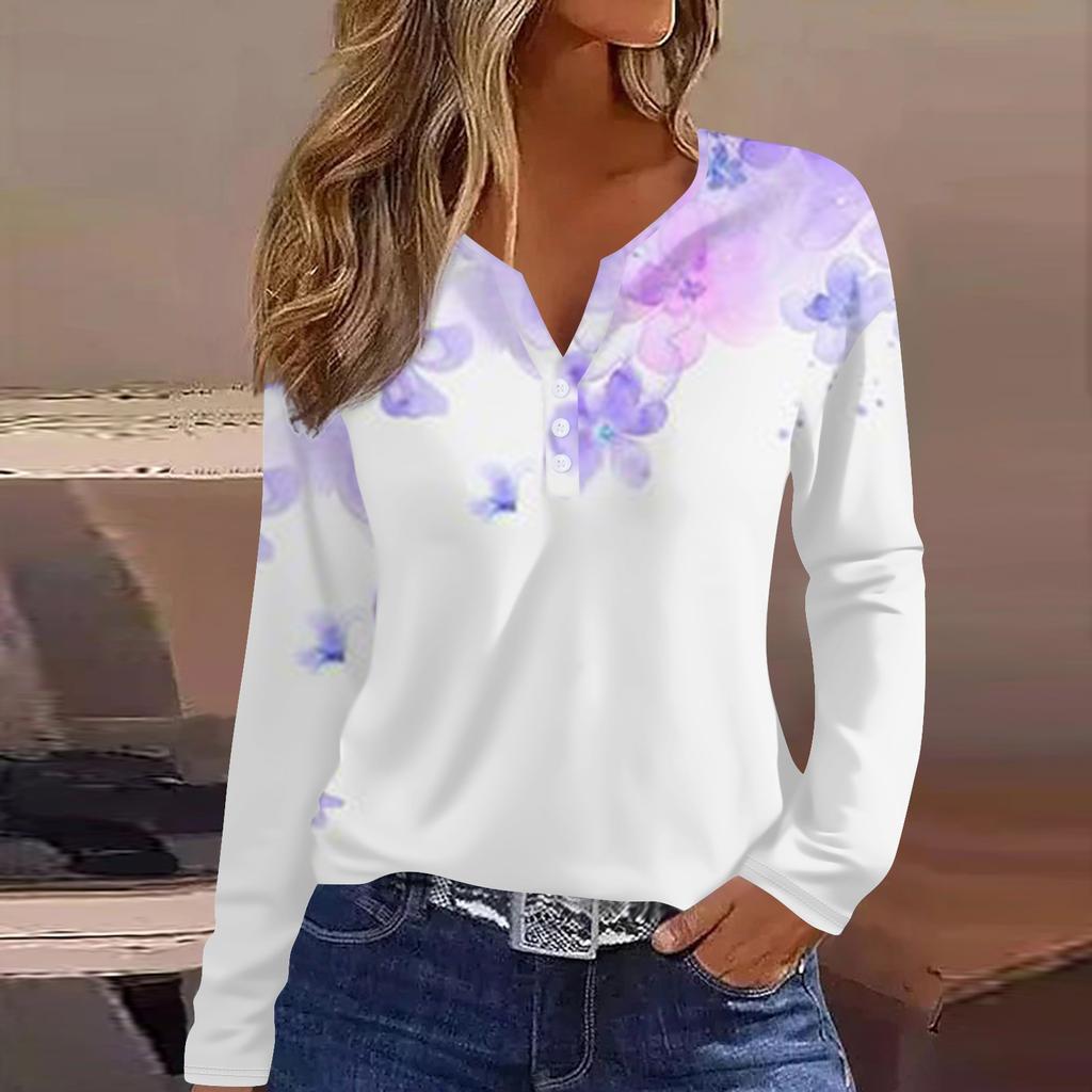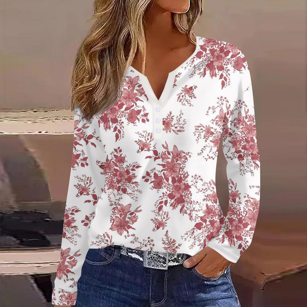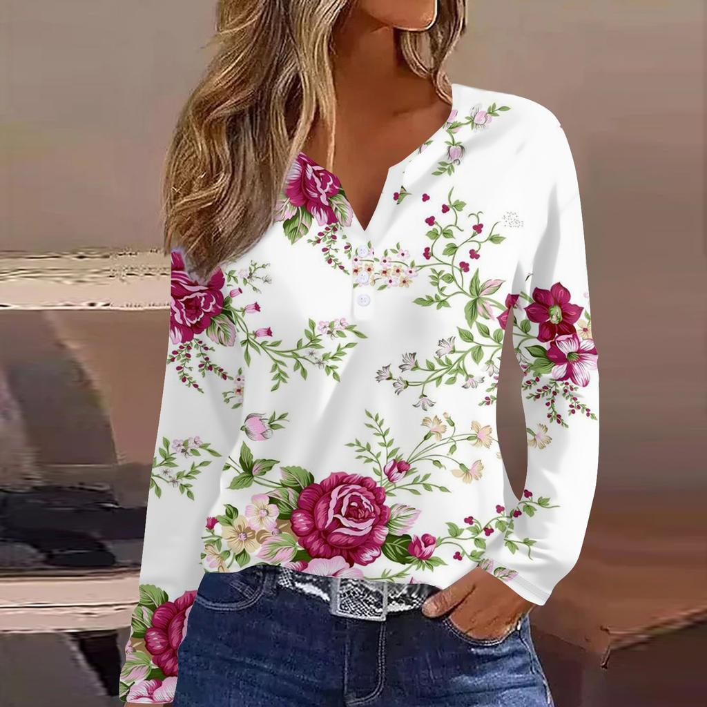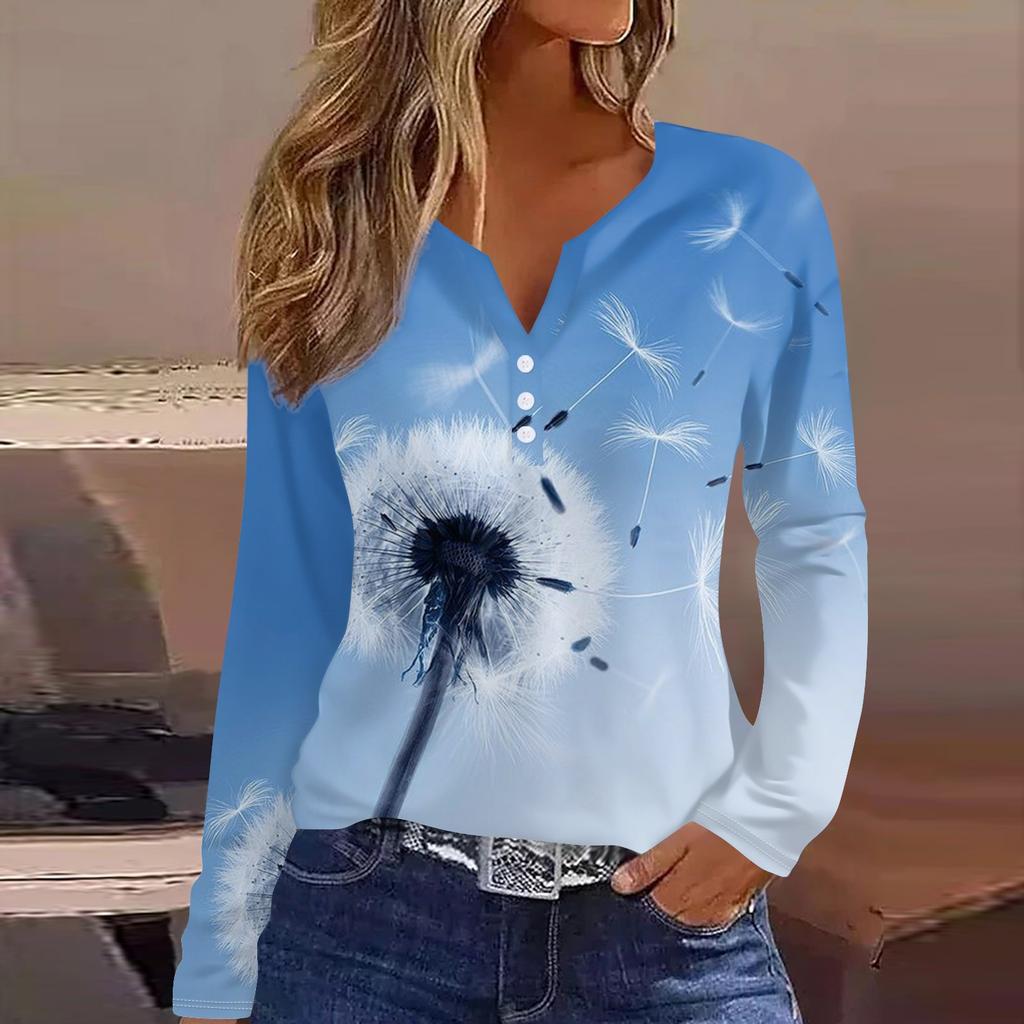Женская модная повседневная футболка с v-образным вырезом и длинным рукавом с принтом, топ на пуговицах