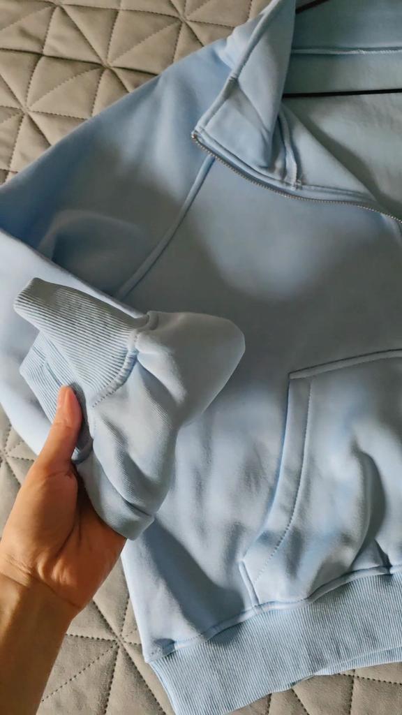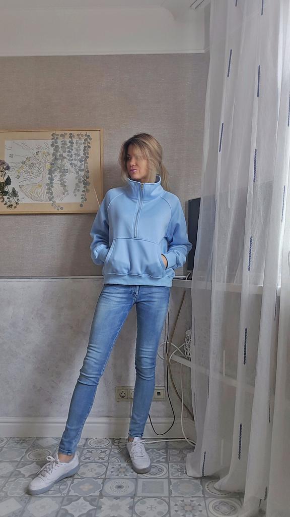 Теплая толстовка с высоким широким горлом 🩵👍 Для себя я выбрала любимый голубой цвет, а в магазине эта кофта представлена в большом ассортименте приятных оттенков. Так же хороший размерный ряд. На мне размер XS, толстовка села как надо 👍 Мой рост 171, 86-66-90. Очень удачный фасон. Толстовка удобная в носке. На улице можно укутаться в уютную объемную горловину. В помещении можно растегнуть молнию и Смотрится стильно 👌👌 А еще есть класная фишка - разрезы для большого пальца на рукавах, иногда хочется сильнее укутаться и это классно смотрится 🔥 Материал с мягким начосом, хорошо греет, 100% полиэстер.