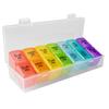 В каждом разделе размещены предметы первой необходимости на неделю, что идеально подходит для эффективной организации ежедневных лекарств и дорожных принадлежностей.