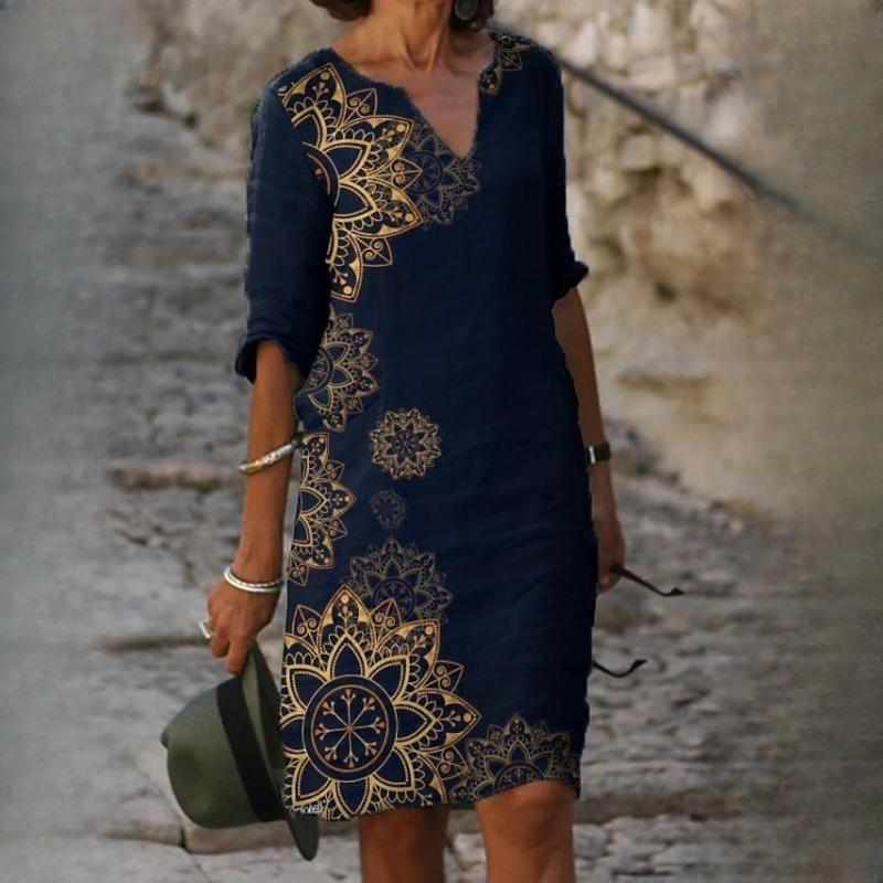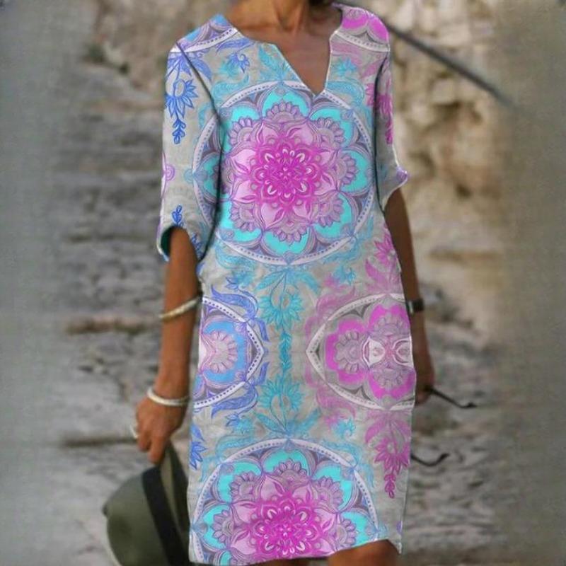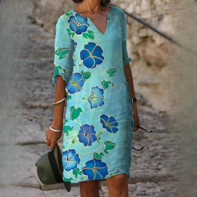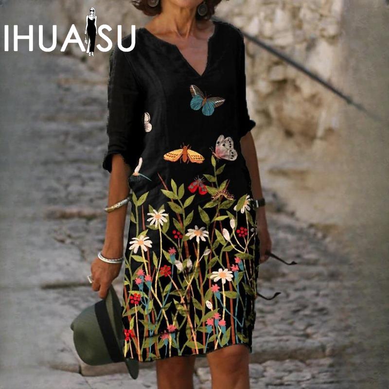 IHUASU Женский летний свободный льняной принт из бамбукового волокна с цветочным принтом и коротким рукавом, женский винтажный литературный круглый вырез, рукав пять точек