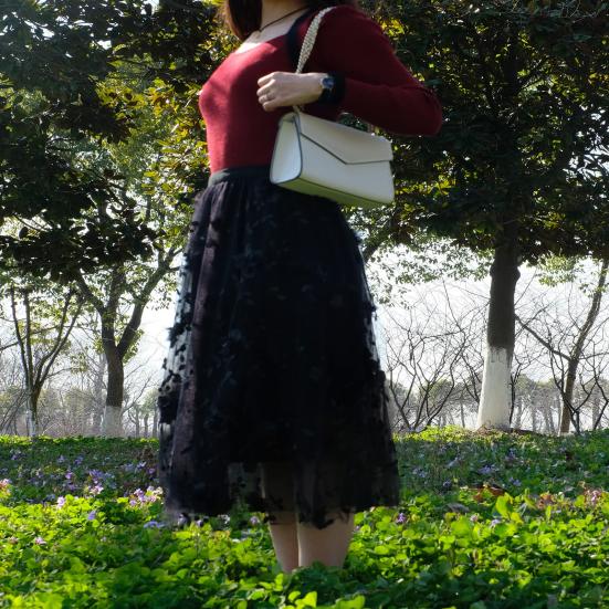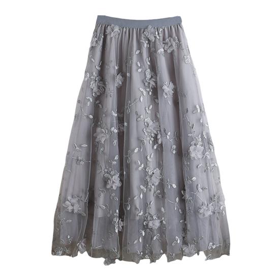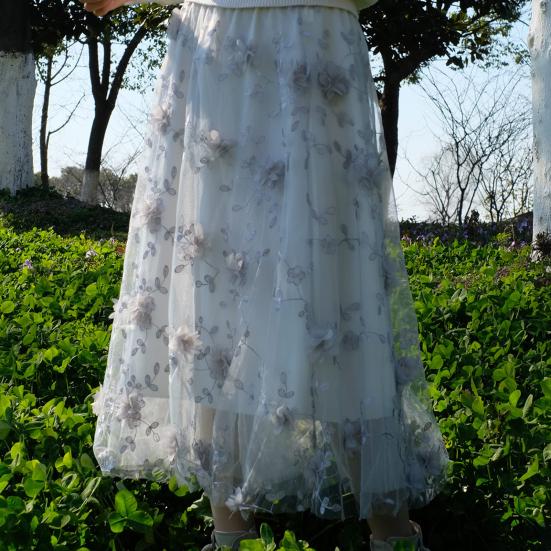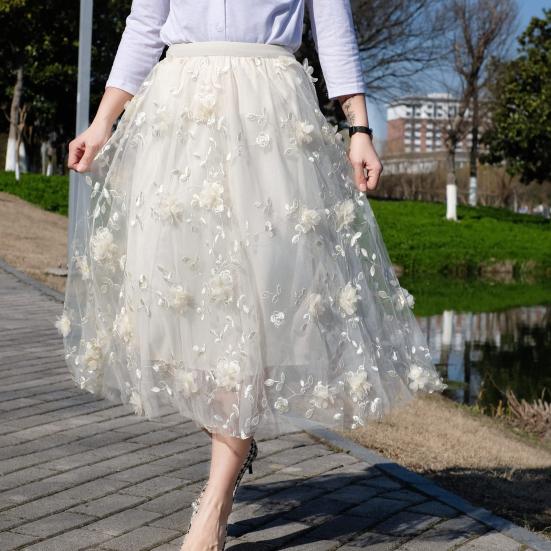 Стильный дизайн: Улучшите свой гардероб с помощью этой модной юбки-миди с высокой талией и объемным подолом, которая идеально подойдет для создания шикарного и модного образа.. Трехмерный дизайн декора и сложная вышивка добавляют нотку элегантности, подчеркивая женственность.