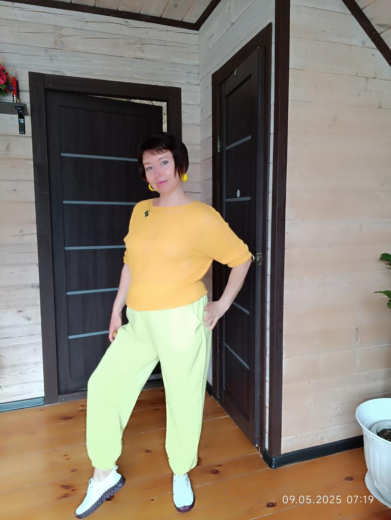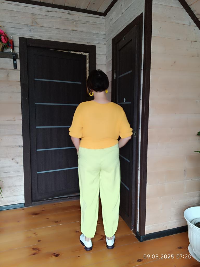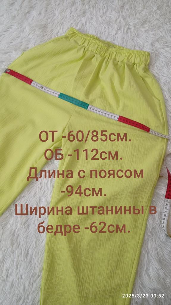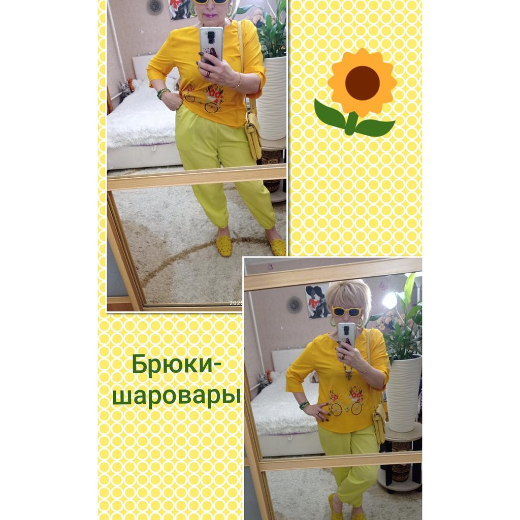 🍋Брюки-шаровары в цвете "лайм'🍋 🍋Классные брючки, но по составу материал вряд ли состоит из смеси хлопка и льна. Думаю, что это конкретная синтетика, плотная, слегка просвечивает. Структура ткани очень интересная, шелковистая,похожа на лёгкую жатку. Мне кажется, что жарким летом в них будет жарковато, но это лишь предположение пока. 🍋Цвет не совпадает с фото продавца, но он обалденный! Очень красивый, яркий, летний, позитивный👍! 🍋Пошиты брюки идеально!!! Везде оверлок, швы ровные, посадка удачная, не высокая и не низкая, удобно сидят. 🍋Фасон обычный. Карманы, пояс на резинке, штанинки внизу тоже на резинках. 🍋На 48/50 и рост 164см.размер 4xl -как на меня шит. Свободненькие, как и должны сидеть штанишки такого фасона.На фото продавца более широкие, там модель худенькая, но меня ширина вполне устраивает, такие широкие мне и не нужны! 🍋Очень довольна покупкой💓Брючки Супер 👍👍👍С удовольствием 🥰буду носить!