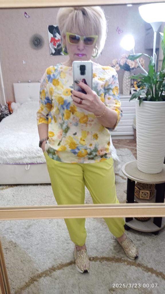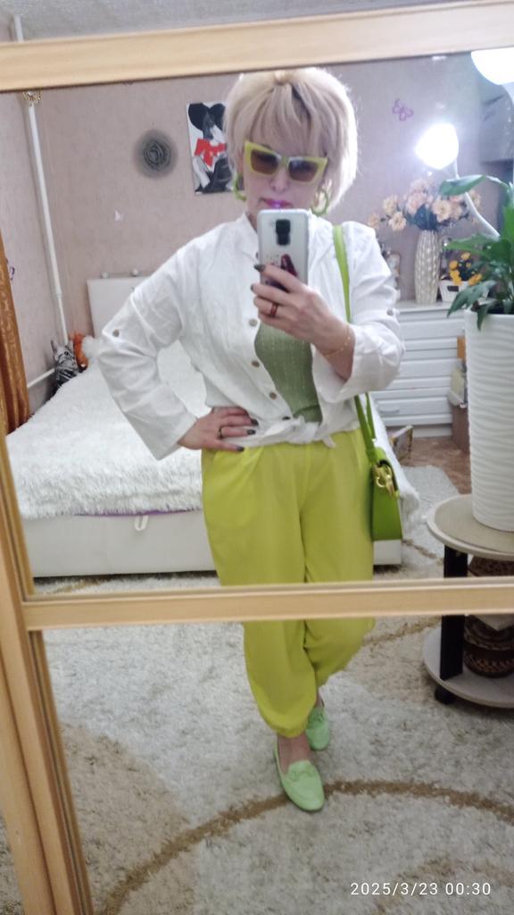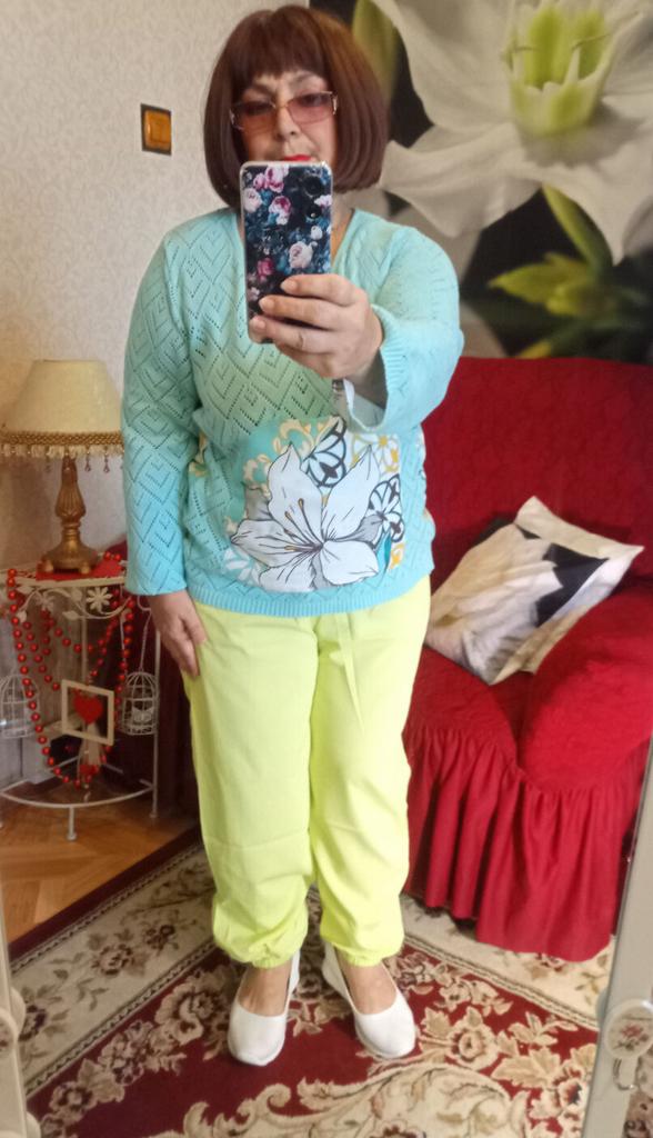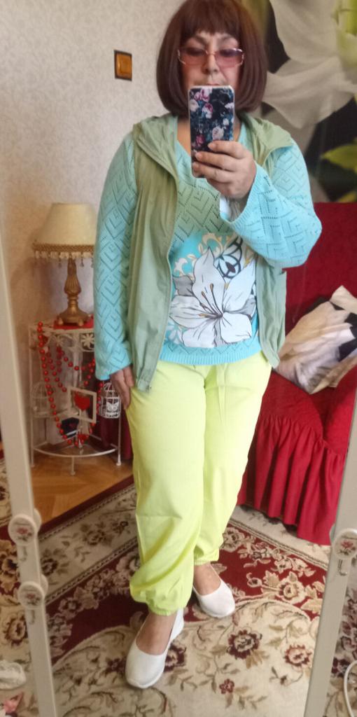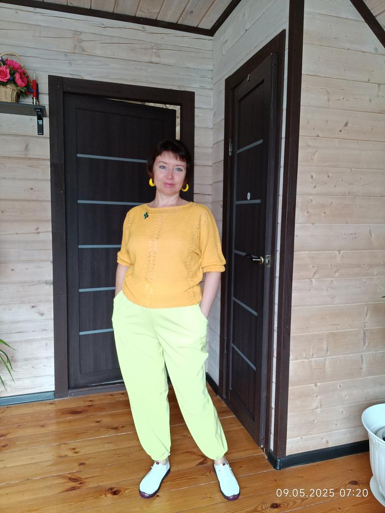 🍋Брюки-шаровары в цвете "лайм'🍋 🍋Классные брючки, но по составу материал вряд ли состоит из смеси хлопка и льна. Думаю, что это конкретная синтетика, плотная, слегка просвечивает. Структура ткани очень интересная, шелковистая,похожа на лёгкую жатку. Мне кажется, что жарким летом в них будет жарковато, но это лишь предположение пока. 🍋Цвет не совпадает с фото продавца, но он обалденный! Очень красивый, яркий, летний, позитивный👍! 🍋Пошиты брюки идеально!!! Везде оверлок, швы ровные, посадка удачная, не высокая и не низкая, удобно сидят. 🍋Фасон обычный. Карманы, пояс на резинке, штанинки внизу тоже на резинках. 🍋На 48/50 и рост 164см.размер 4xl -как на меня шит. Свободненькие, как и должны сидеть штанишки такого фасона.На фото продавца более широкие, там модель худенькая, но меня ширина вполне устраивает, такие широкие мне и не нужны! 🍋Очень довольна покупкой💓Брючки Супер 👍👍👍С удовольствием 🥰буду носить!