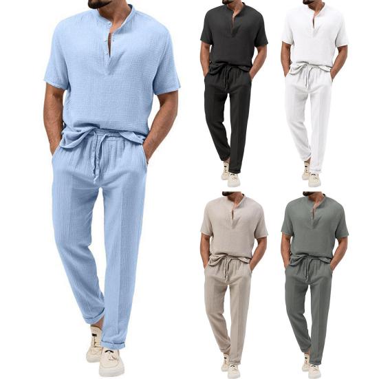 Универсальный мужской комплект из двух предметов: Улучшите свой повседневный гардероб с помощью этого стильного и удобного мужского костюма, который имеет стандартный крой, который подчеркивает вашу фигуру и обеспечивает максимальный комфорт.. В комплект входит топ с воротником-стойкой, короткими рукавами и брюки на резинке на талии, создающие повседневный, но собранный образ, подходящий для различных случаев.