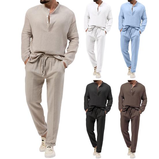 Универсальный мужской костюм: Улучшите свой повседневный гардероб с помощью этого комплекта из двух предметов: топа с воротником-стойкой, длинными рукавами и брюк на эластичной талии..