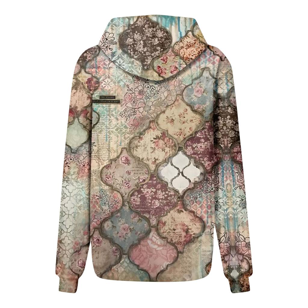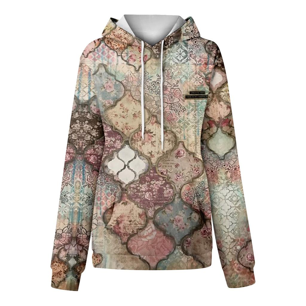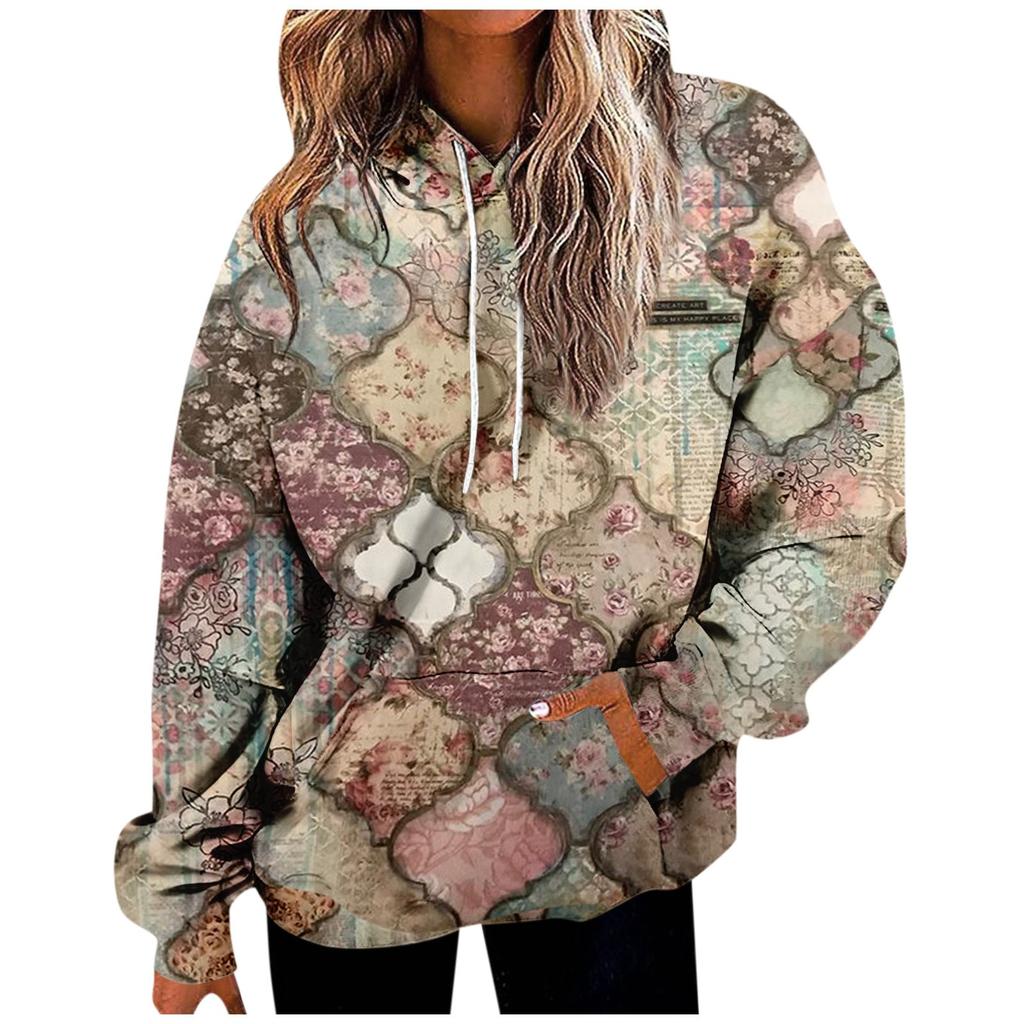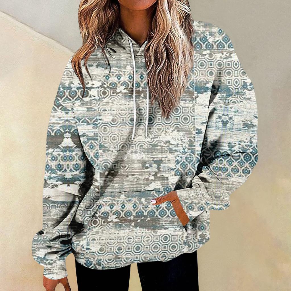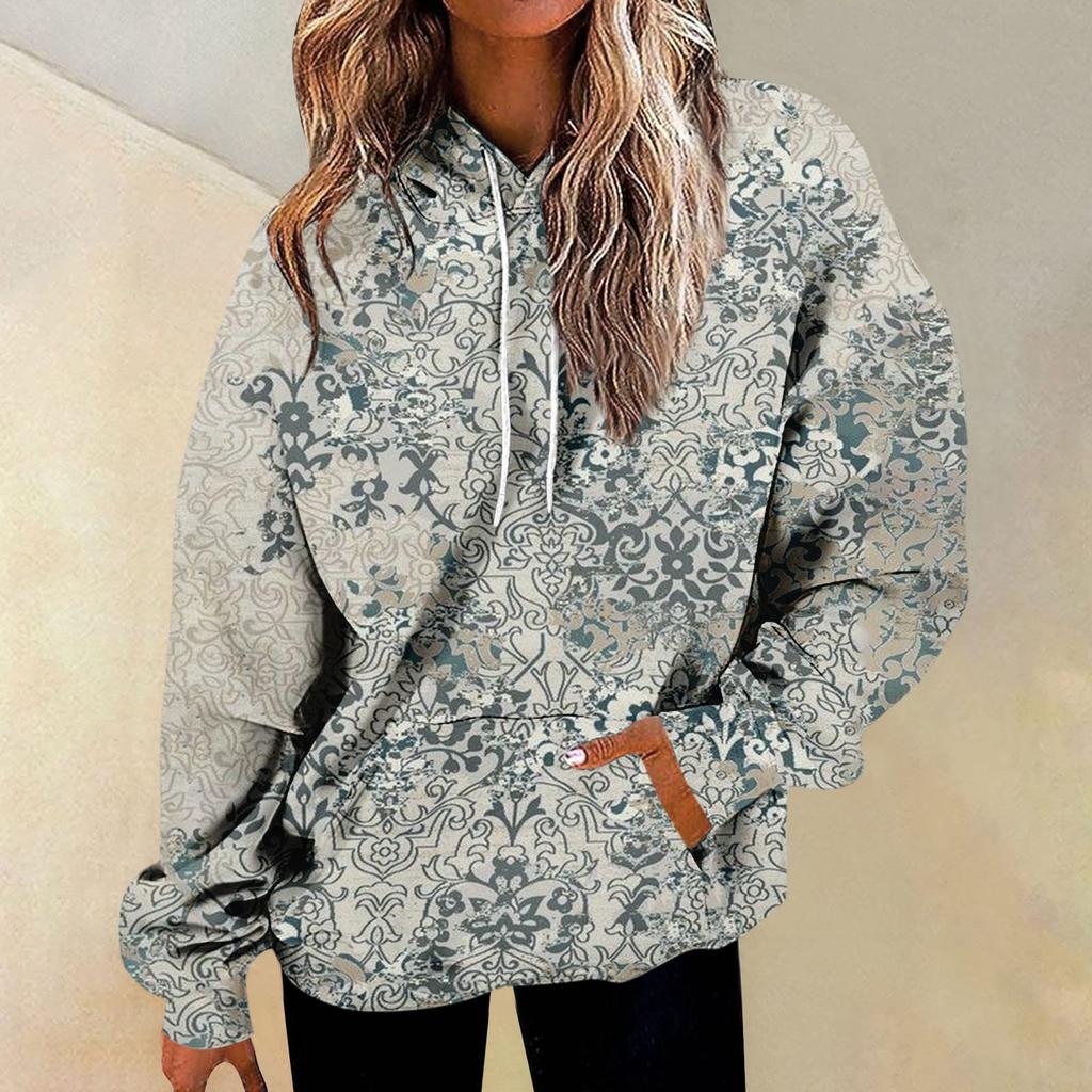 Женская повседневная мода винтажный принт длинный рукав пуловер с капюшоном топ