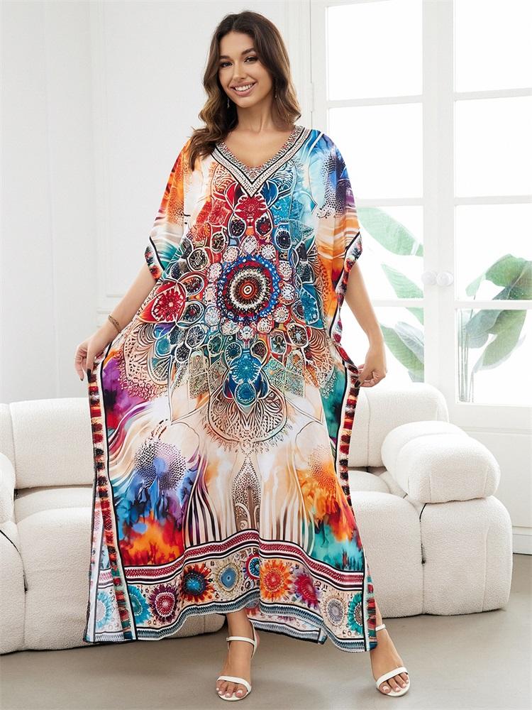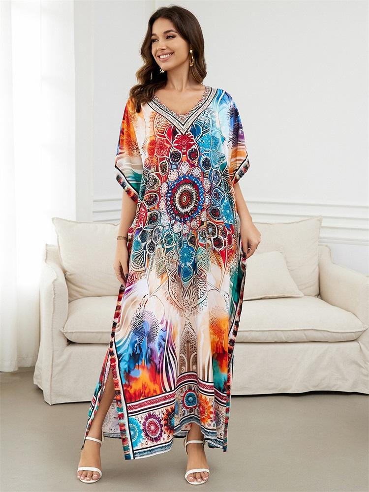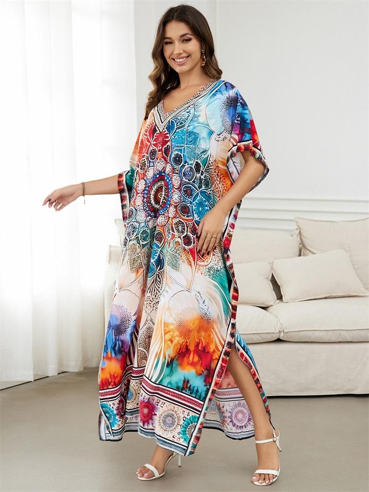 2024 Bohemian Chic Printed Batwing Sleeve V-образный вырез с разрезом по бокам Макси-платье Женская летняя одежда Пляжная одежда Купальный костюм Накидка Q1594