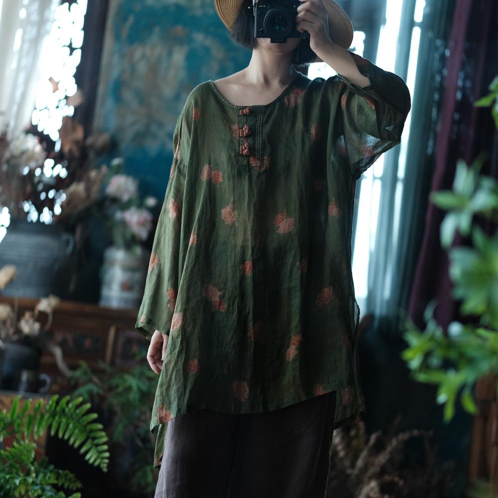 Johnature Женские винтажные футболки с цветочным принтом, с круглым вырезом и длинным рукавом, свободные осенние женские футболки с пуговицами
