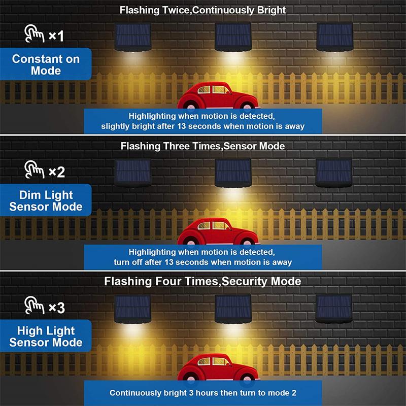 3 режима солнечного наружного освещения:1 нажатие в режим постоянного света, подсветка после обнаружения движения;2. Нажмите кнопку в режиме датчика, свет включится после обнаружения людей и выключится, когда люди уйдут.;3. Нажмите для перехода в режим безопасности, через три часа постоянного освещения переключитесь в режим 2.(0-6 метров, угол обнаружения 120°)